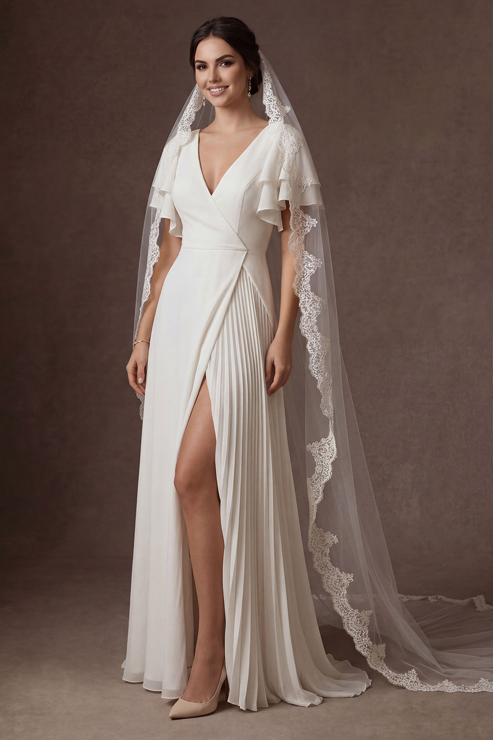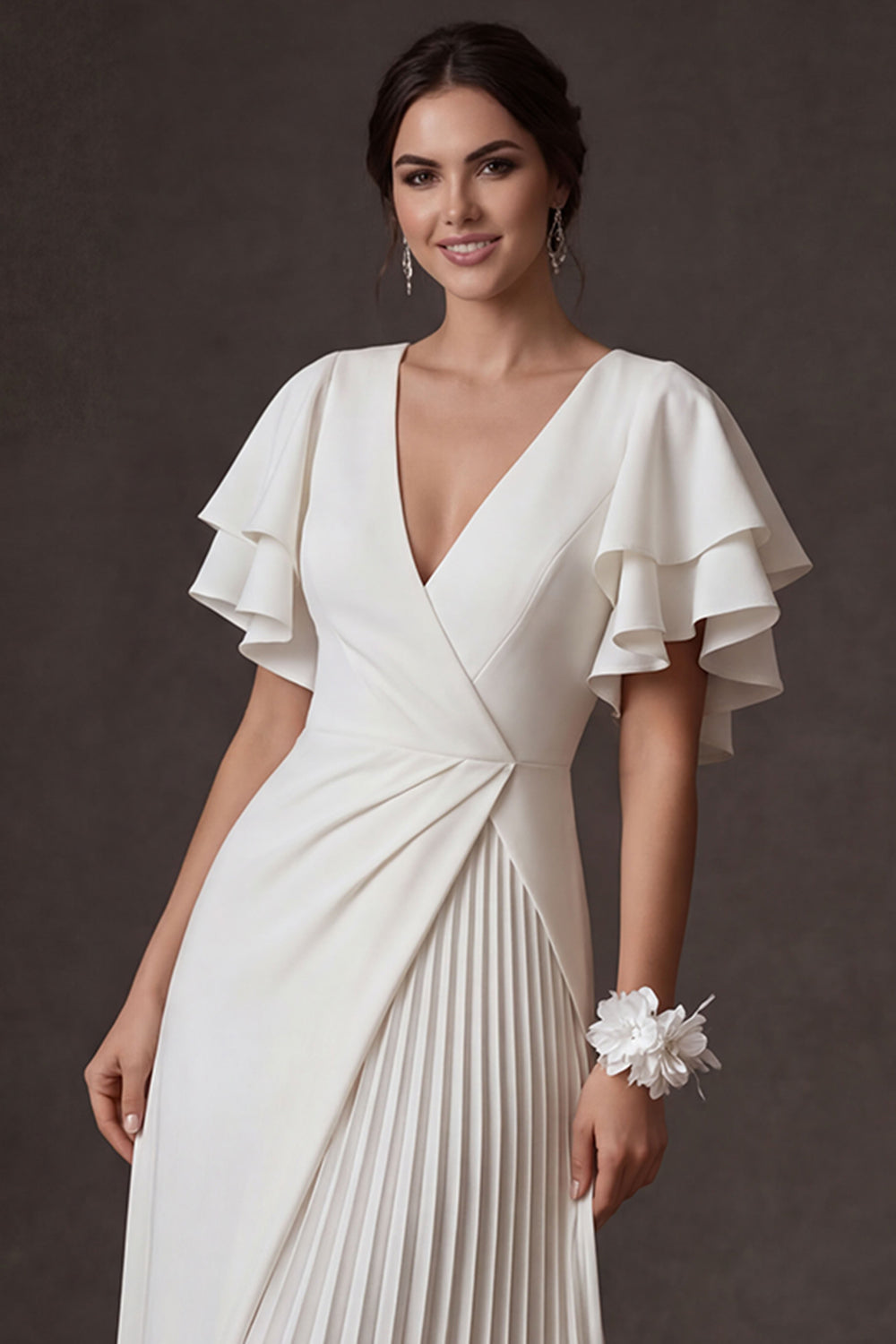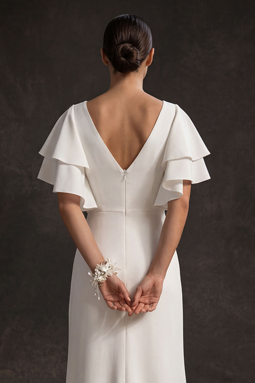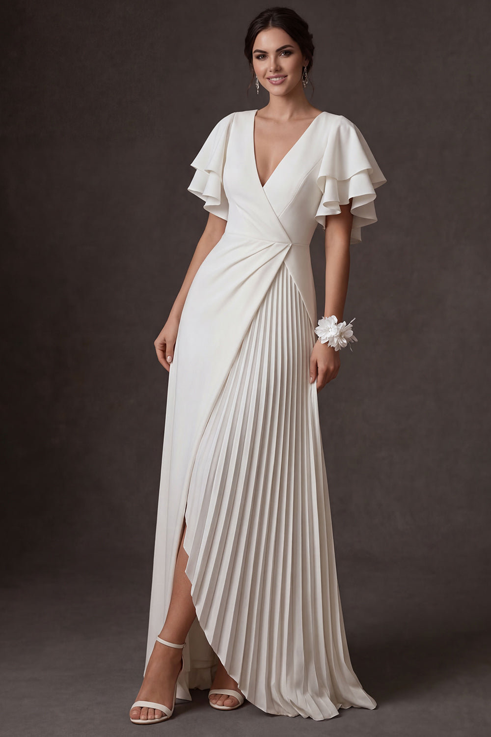 A Line Ruffled White V Neck Short Sleeves Ruched Long Wedding Dress with Slit