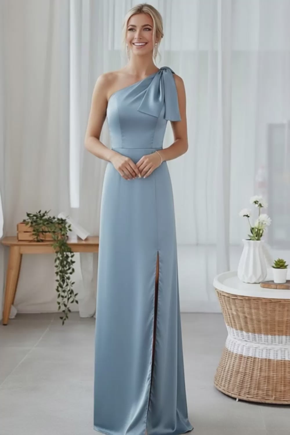 Blue Sheath One Shoulder Satin Maxi Bridesmaid Dress with Slit