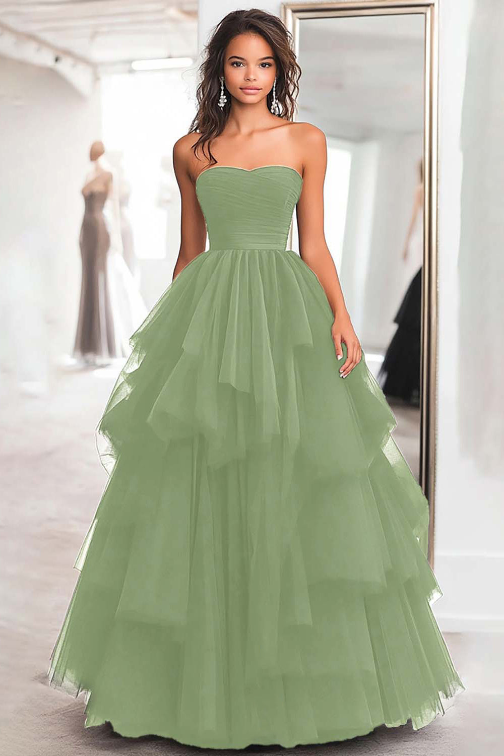 Black Ball Gown Tulle Tiered Strapless A Line Prom Dress