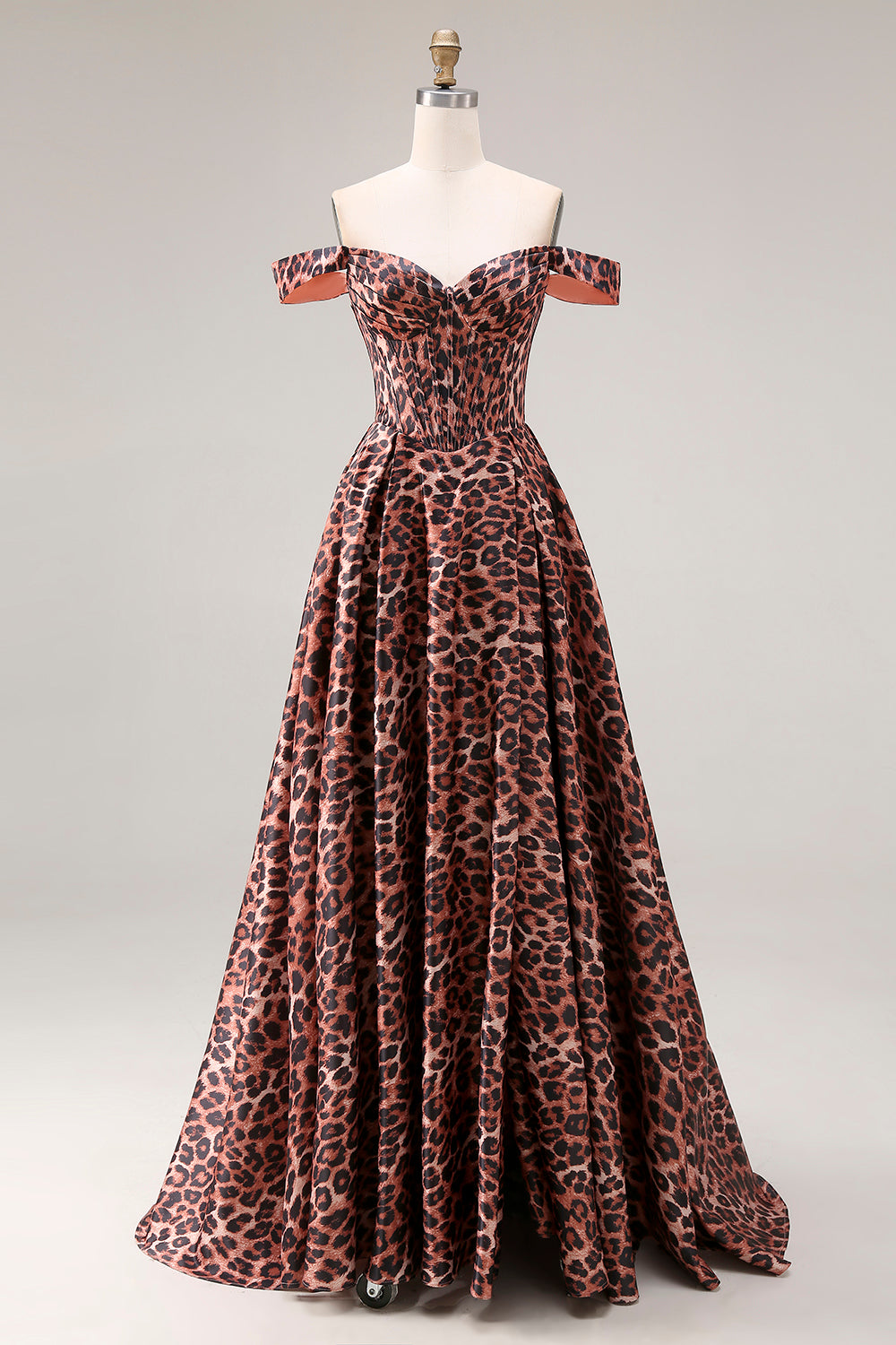 Coffee Leopard A Line Off the Shoulder Corset Long Prom Dress with Slit