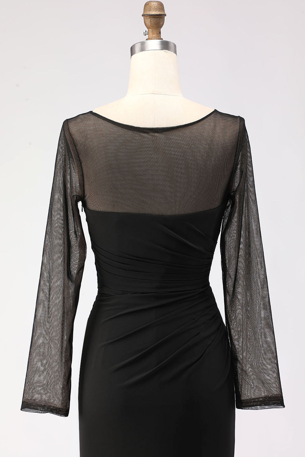 Black Maxi Mermaid Illusion Neck Ruched Formal Dress with Silt