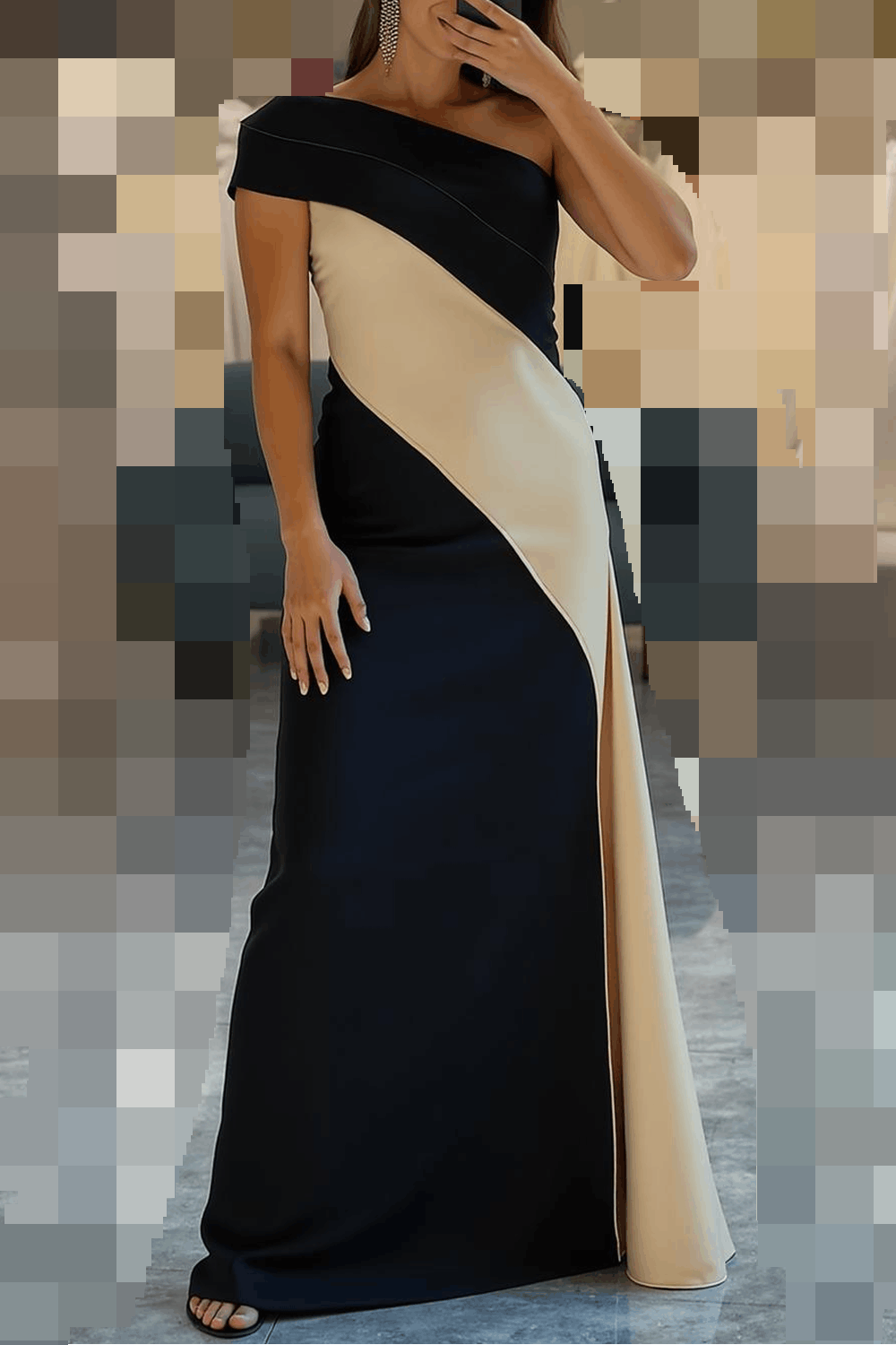 Black and Ivory One Shoulder Sheath Maxi Formal Dress