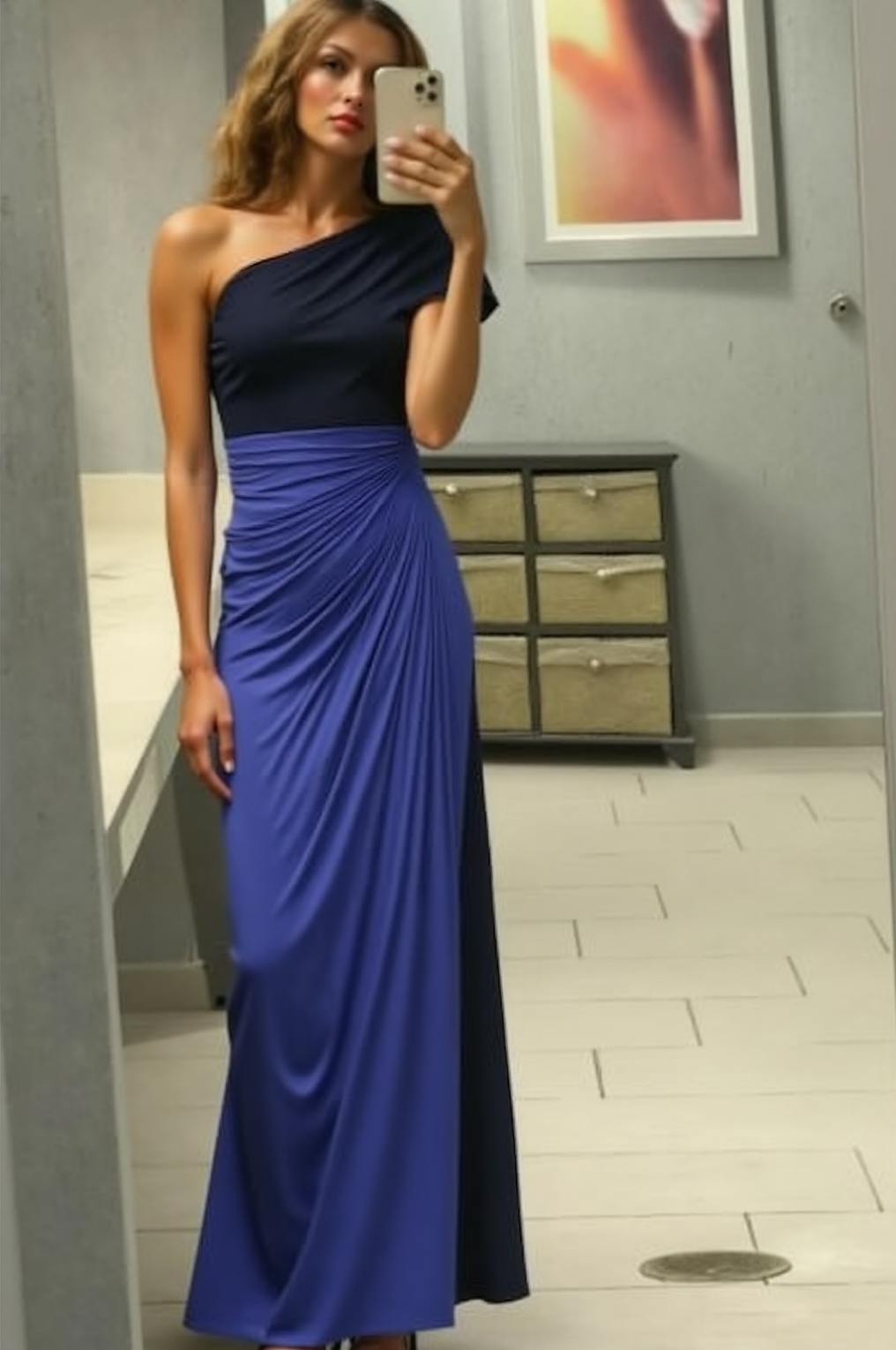 This sophisticated maxi dress in a rich brown hue features a flattering one-shoulder neckline and delicate ruching that drapes elegantly along the slender silhouette. The fabric skims the figure with refined precision, flowing into a graceful floor-length hem. Ideal for black-tie events, this design offers a modern take on eveningwear with its timeless colour and sculptural details.