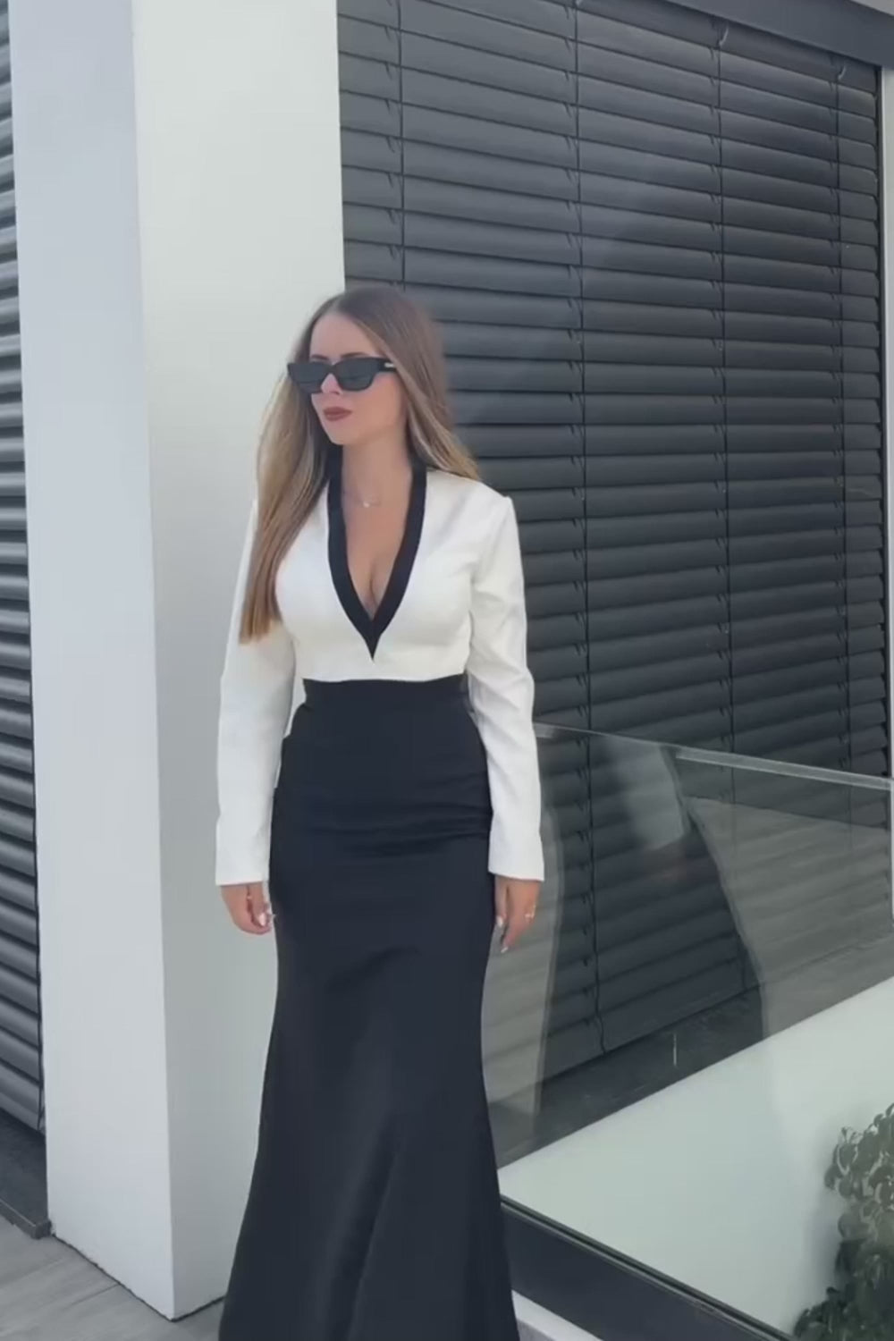White and Black V Neck Mermaid Long Formal Dress with Sleeves