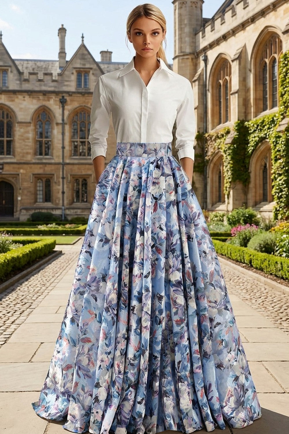 2 Piece White and Blue Flower Collar Neck Maxi Mother of the Bride Dress
