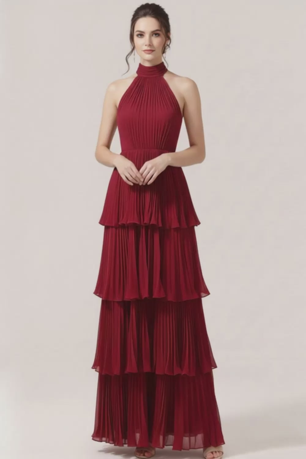Burgundy Chiffon Tiered Backless Pleated Long Bridesmaid Dress with Ruffles