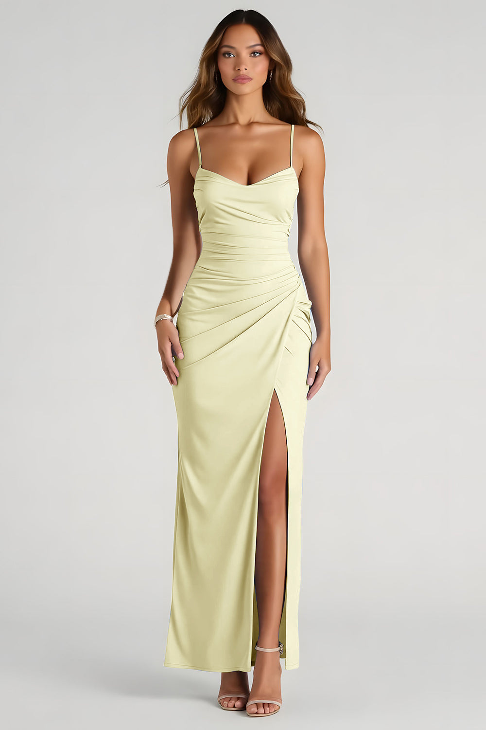 This graceful sheath dress in soft light blue chiffon features delicate ruching and a discreet thigh slit. The slender, long length silhouette drapes beautifully, creating a romantic and sophisticated look perfect as a bridesmaid dress or for the red carpet. Lightweight and ethereal, it is equally ideal for summer weddings, formal evenings, or any special occasion.