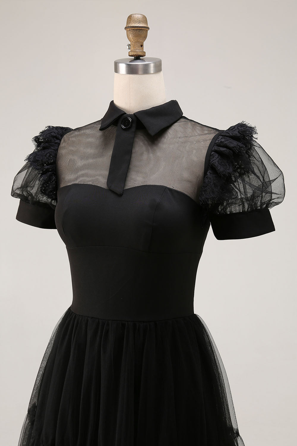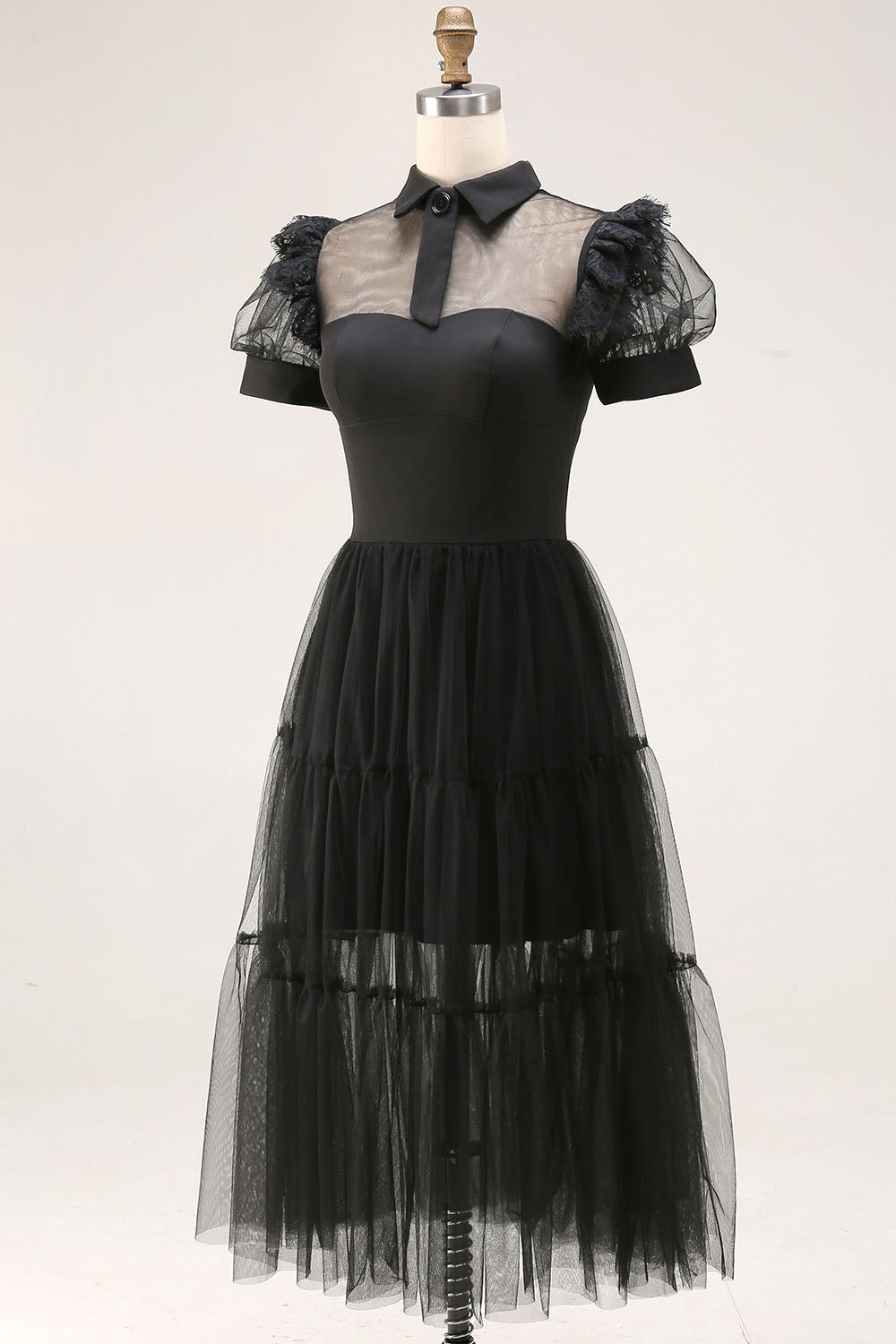Black A Line Collar Neck Tulle Midi Cocktail Dress with Sleeves