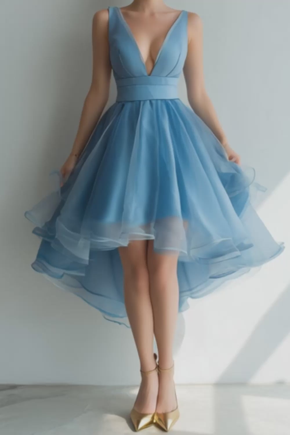 Blue A Line Deep V-Neck High Low Cocktail Dress with Ruffles