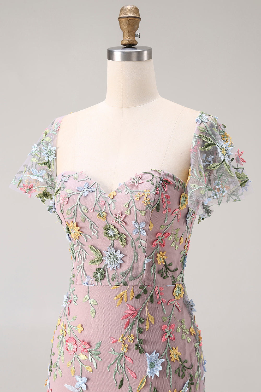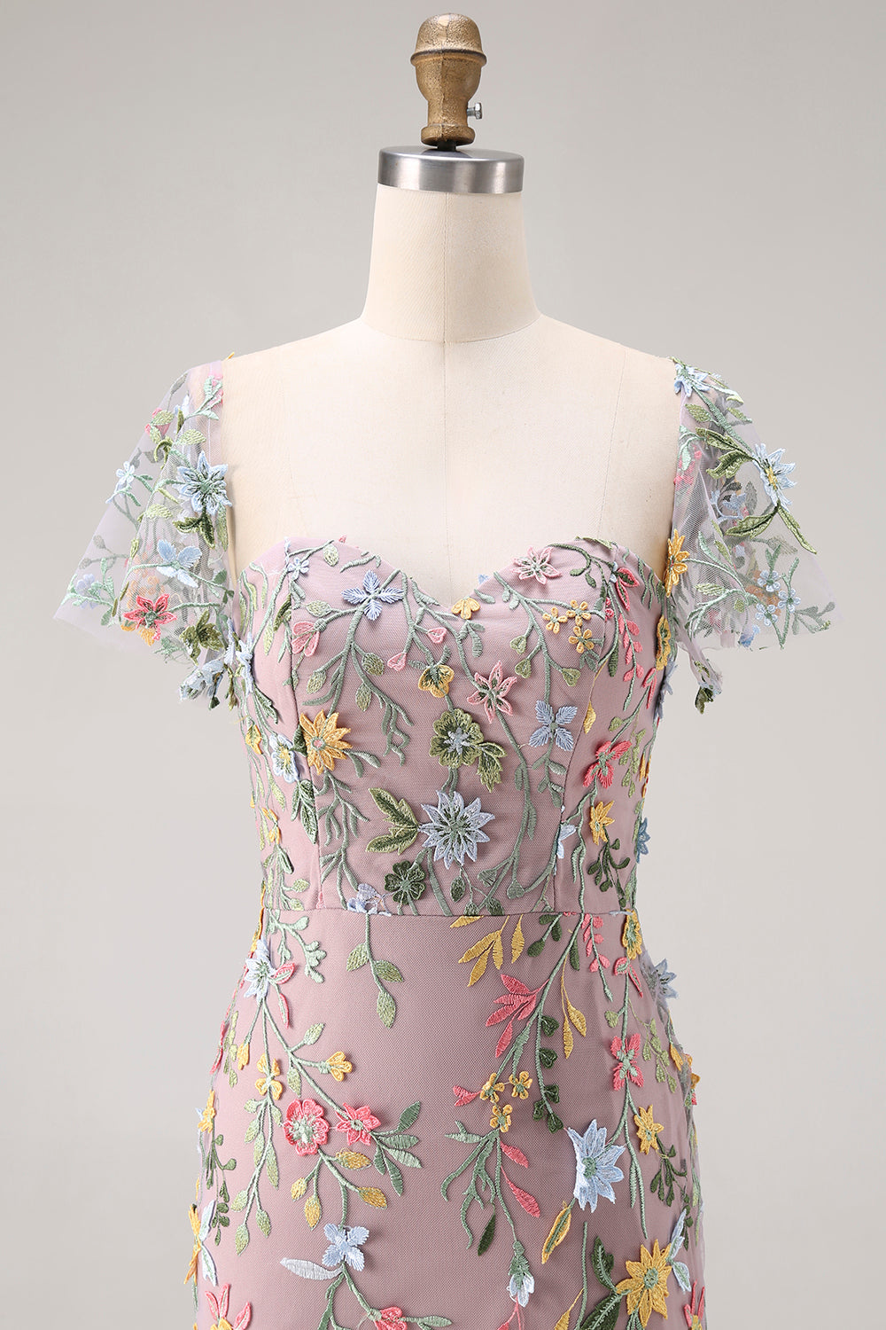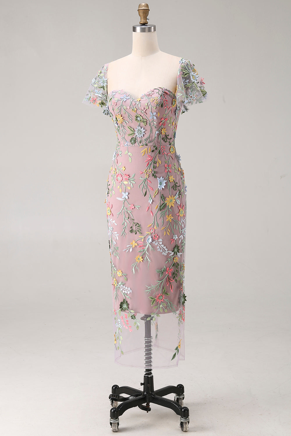 Mauve Floral Tulle Sheath Embroidered Midi Wedding Guest Dress with Sleeves