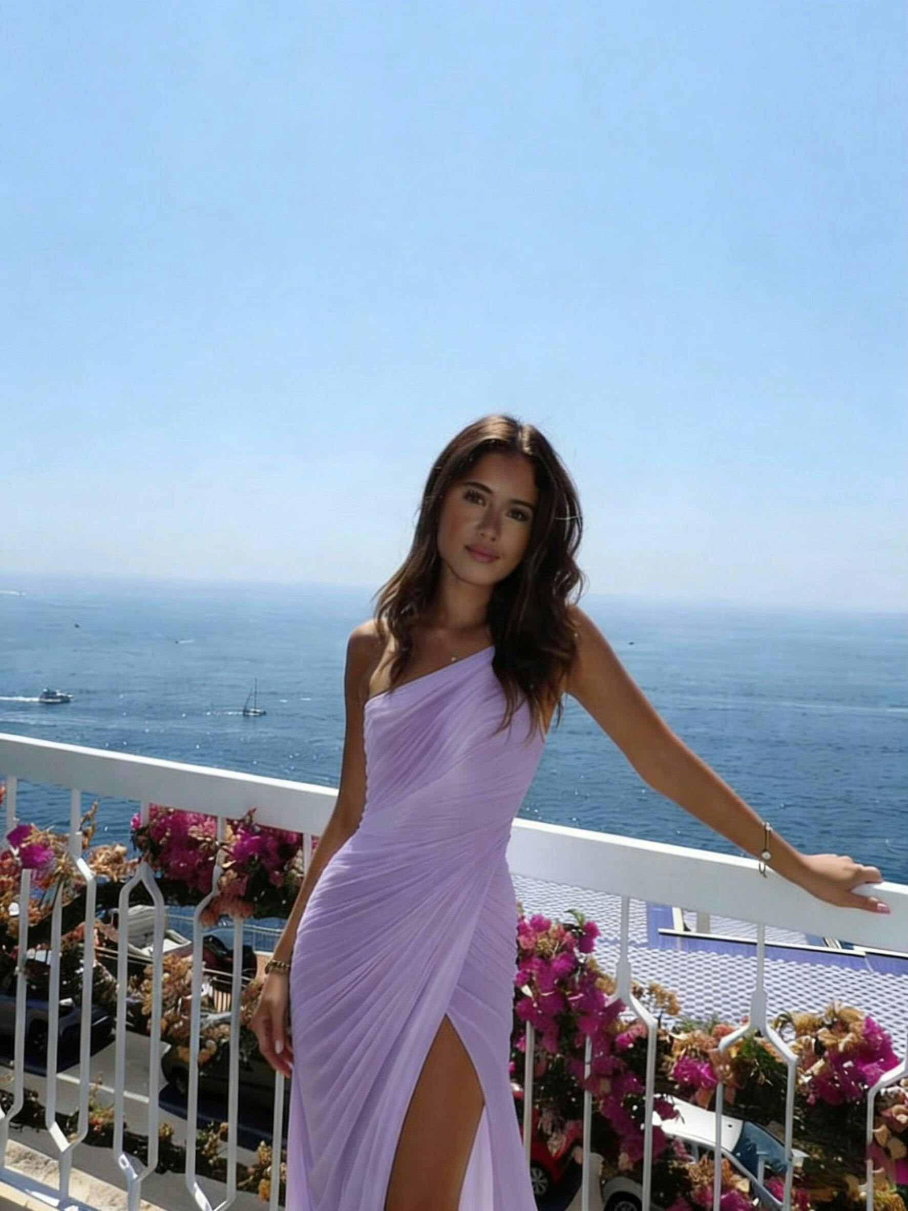 Radiating effortless charm, this dress is a dreamy choice for seaside celebrations or romantic outdoor moments. The elegant one-shoulder neckline brings a modern asymmetrical touch, while the ruched bodice flatters the figure with gentle texture and definition. Crafted from airy chiffon, the flowing maxi skirt drapes beautifully with every step, creating a light, ethereal silhouette perfect for a beach setting. A thigh-high slit adds a hint of allure and allows for easy movement, balancing grace with a subtle edge. This dress is a stunning blend of softness and sophistication, ideal for brides-to-be who want to feel both free-spirited and chic on their special day.