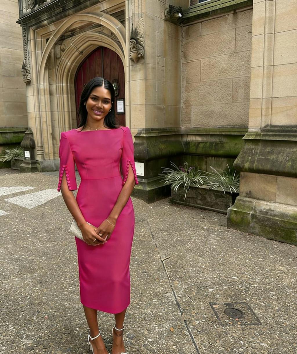 This sophisticated sheath dress in crisp white features a classic bateau neckline and a graceful midi silhouette. The tailored cut skims the body with refined precision, crafted from premium stretch fabric that ensures both comfort and structure. Ideal for formal occasions, its clean lines and timeless design offer understated elegance, making it a versatile choice for weddings, galas, or black-tie events.