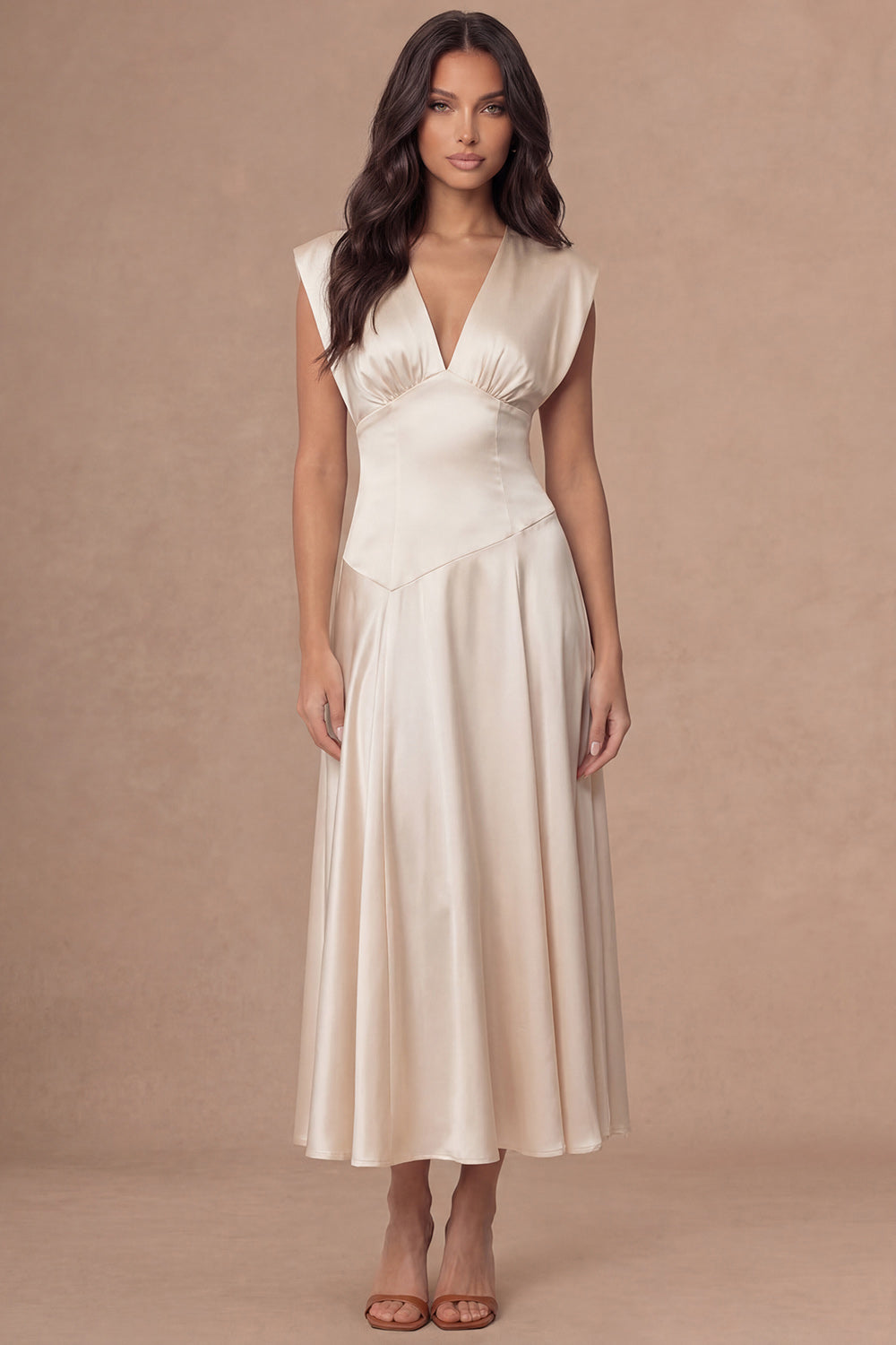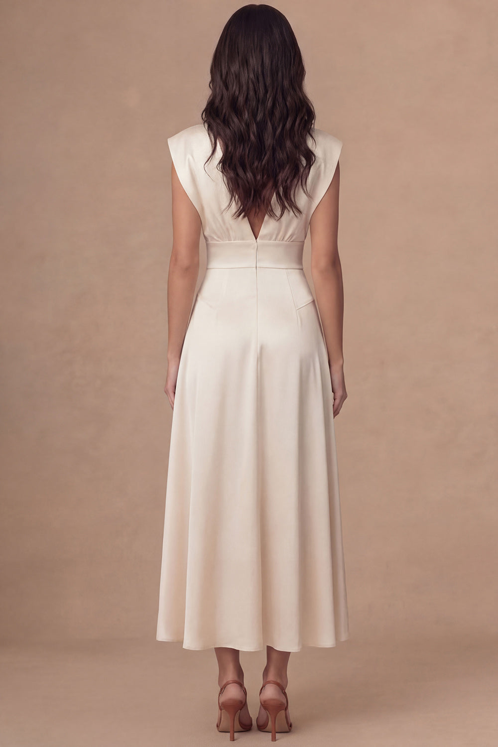 Sheath Ivory V Neck Satin Sleeveless Midi Engagement Dress
