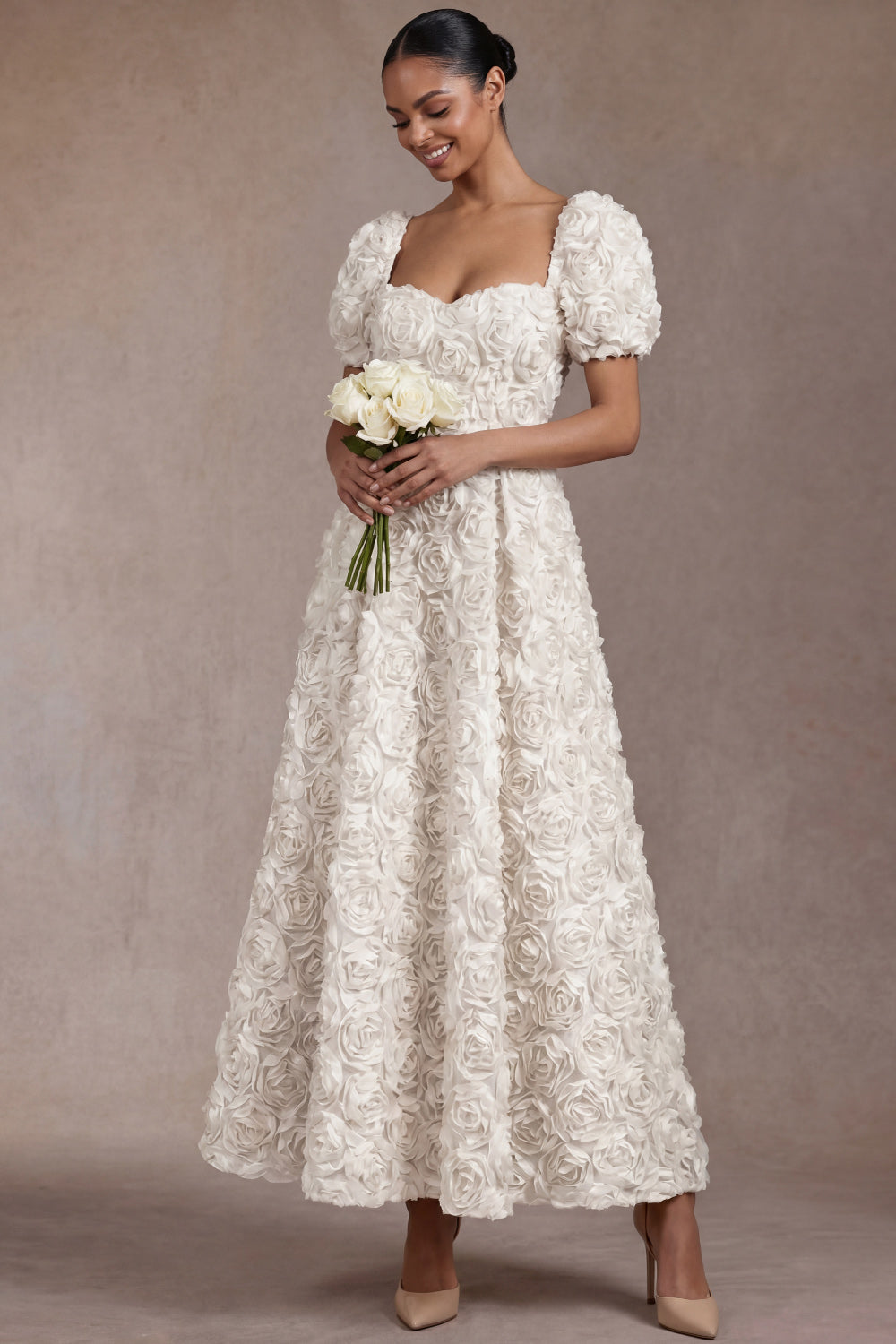 White A Line Sweetheart Floral Short Sleeves Long Engagement Dress