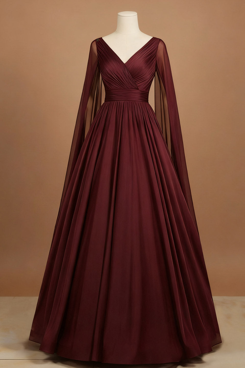 Burgundy V-Neck A Line Satin Long Formal Dress with Side Cape