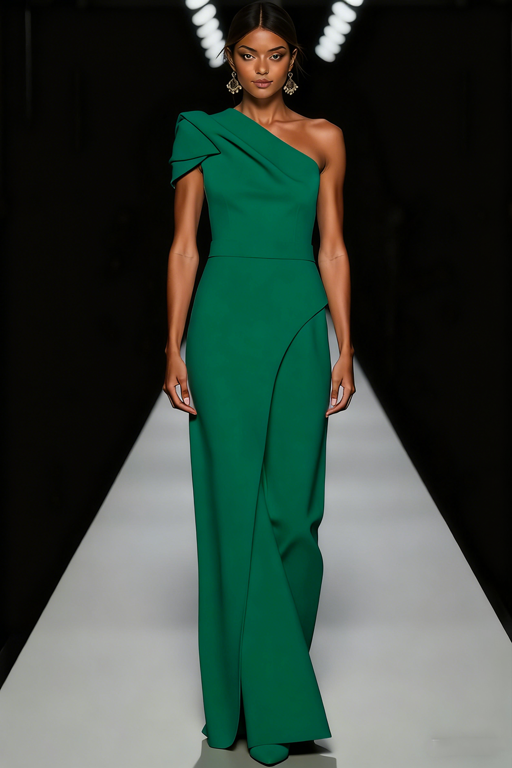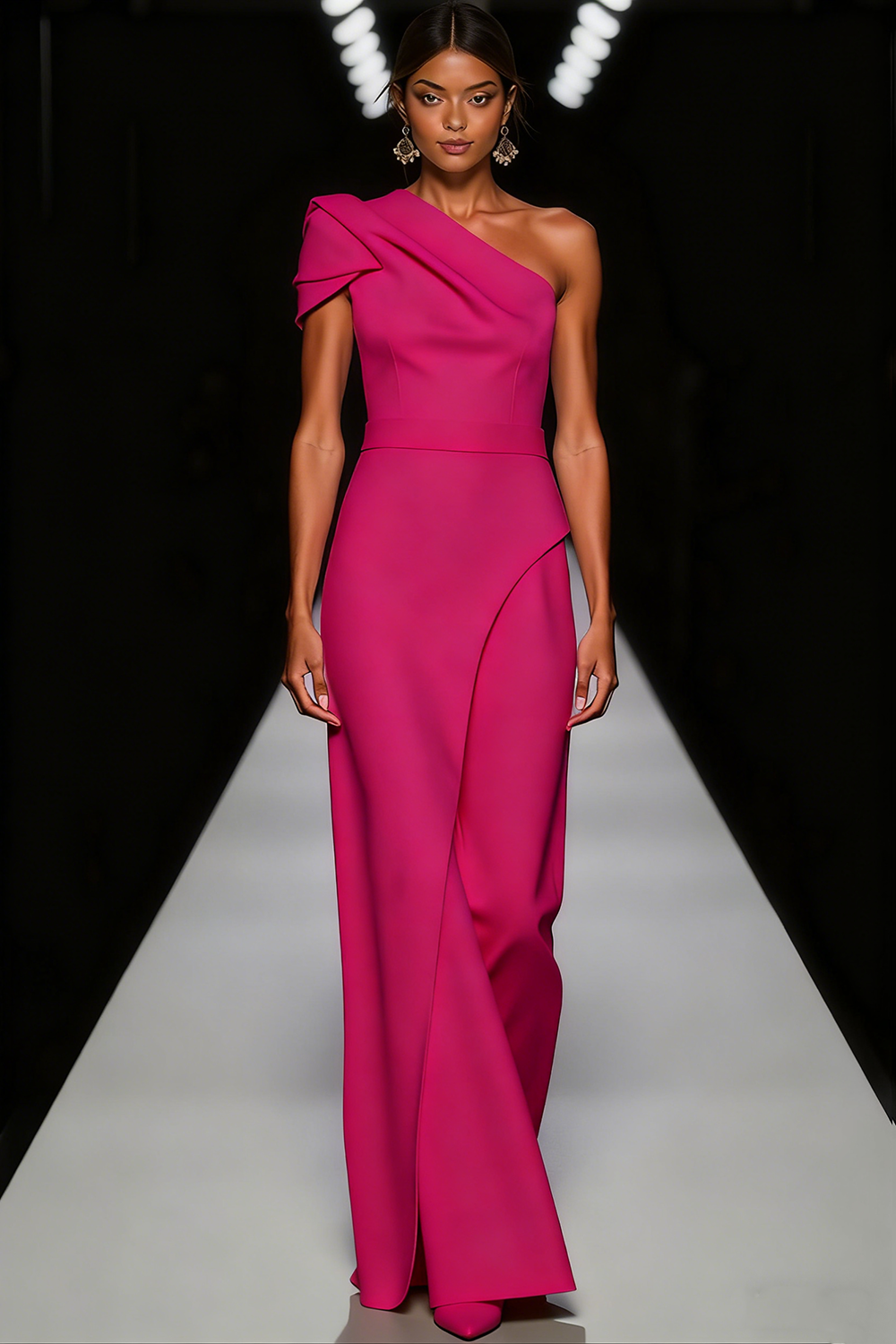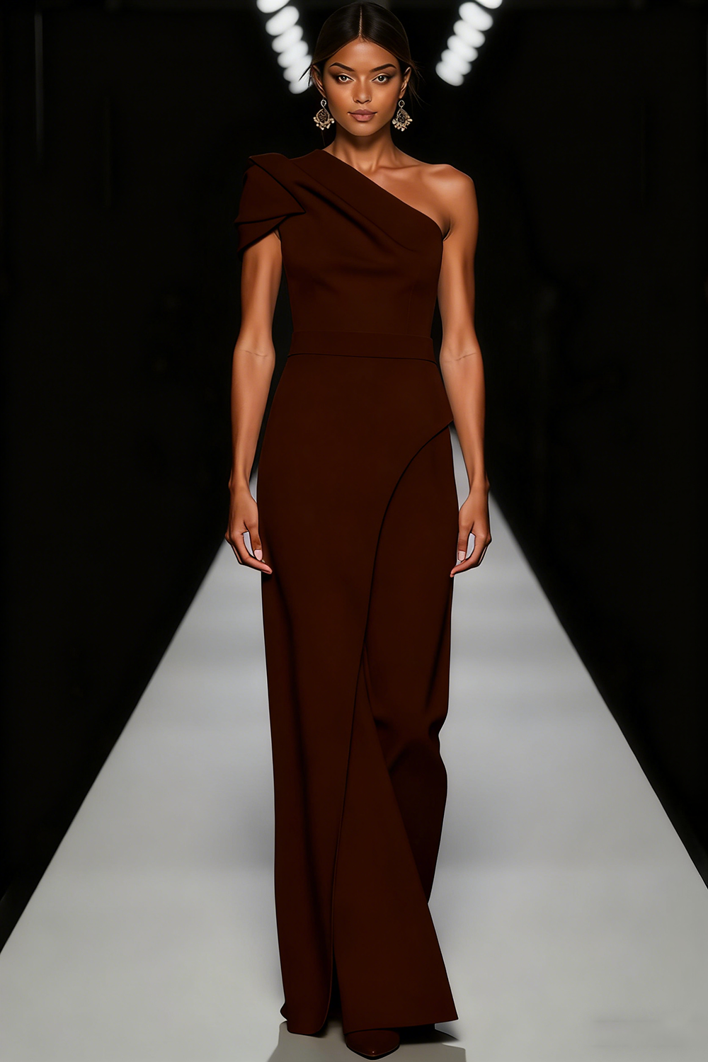 This sophisticated sheath gown in crisp white features a graceful one-shoulder neckline that flows into a streamlined silhouette. The columnar cut skims the figure elegantly, extending to a floor-length hem for a timeless formal look. Ideal for black-tie events, its clean lines and sculptural drape create understated glamour with effortless polish.