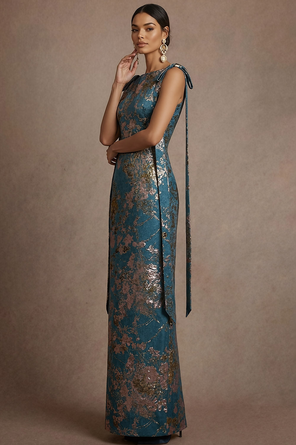Blue Jacquard Sheath Floral Round Neck Long Formal Dress with Bow