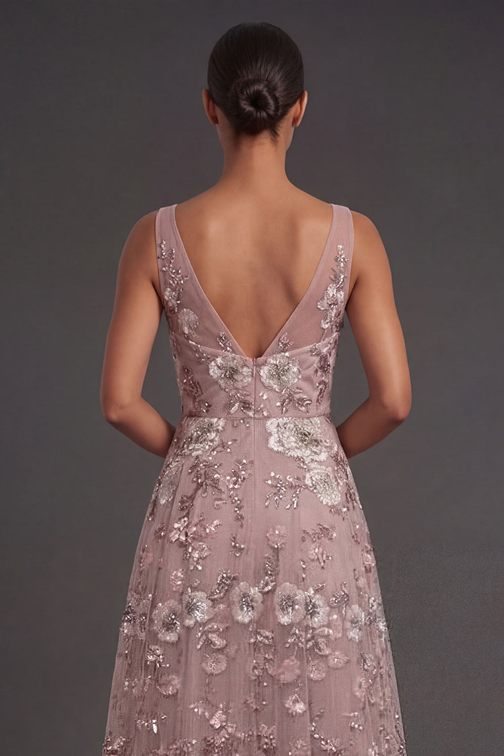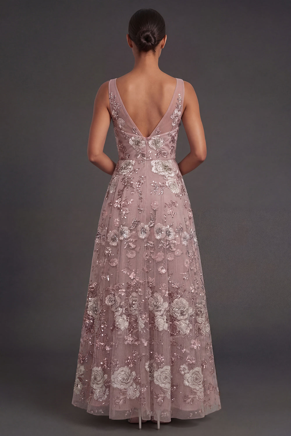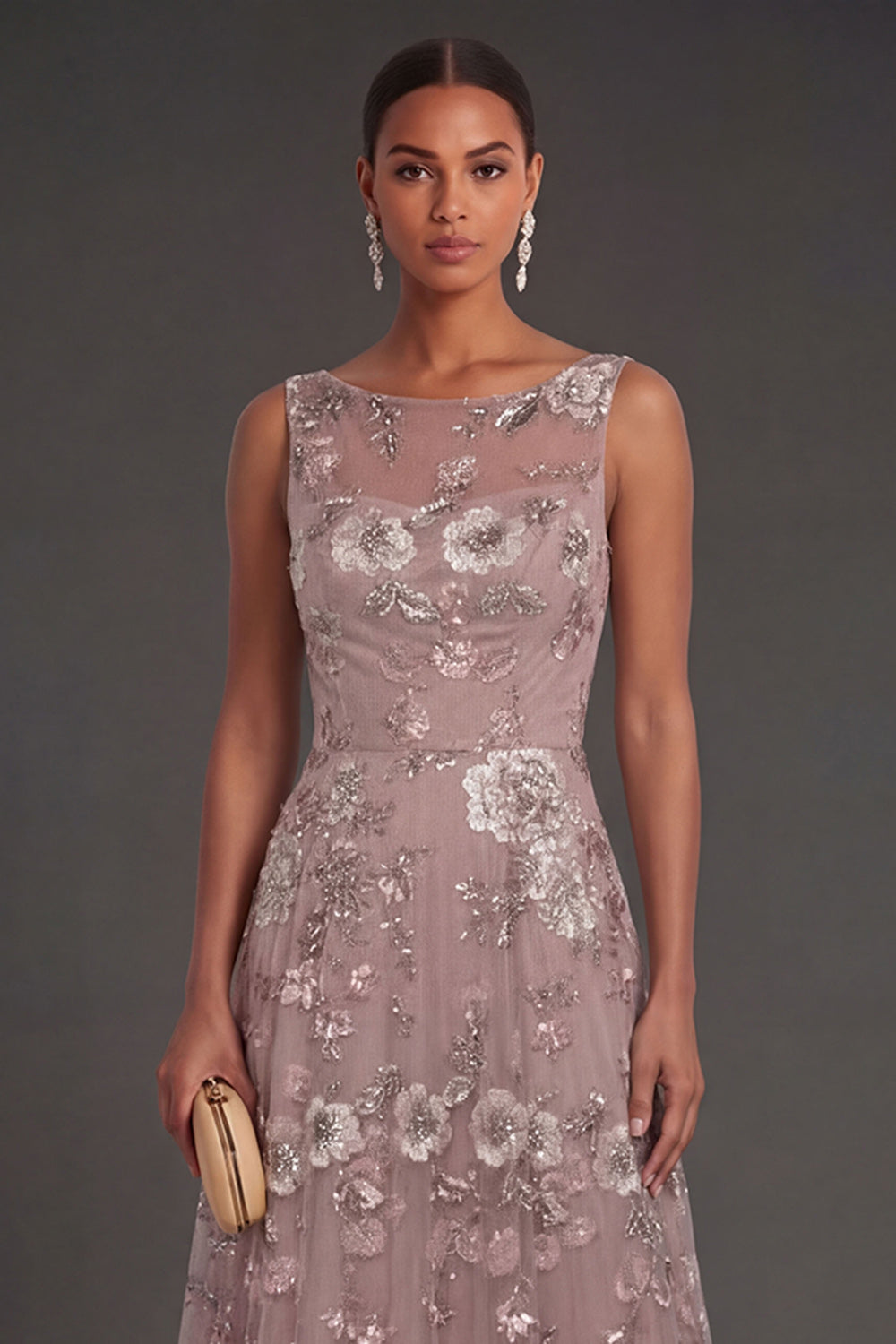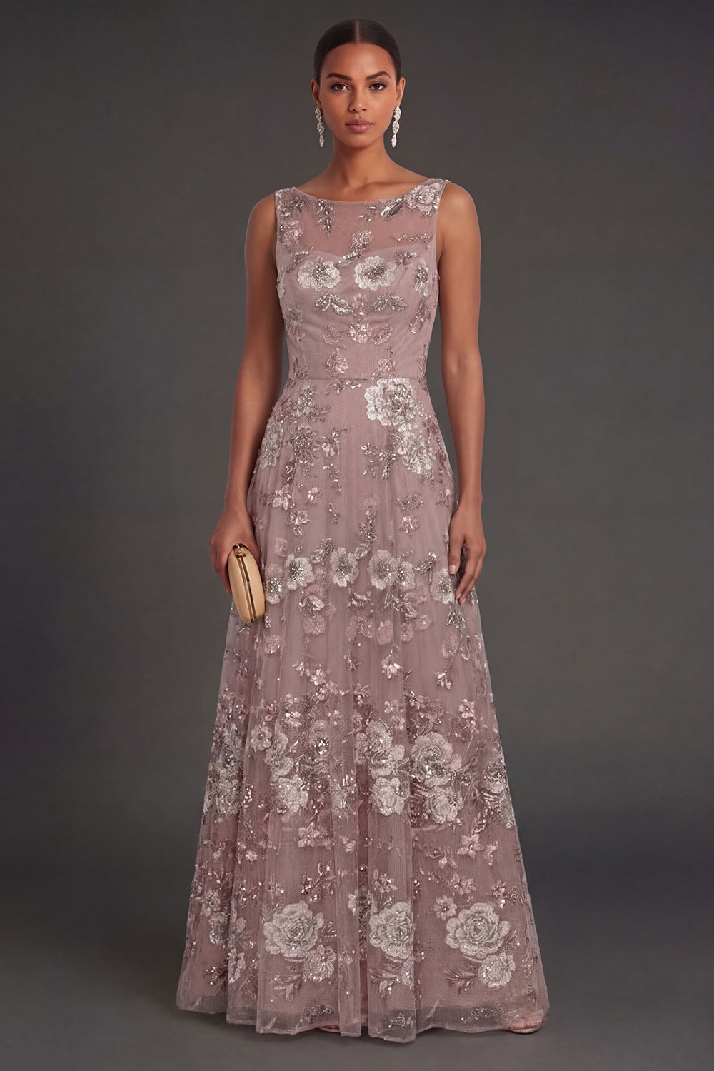 Floral Dusty Rose Sparkly Beaded Appliqued A Line Long Wedding Guest Dress
