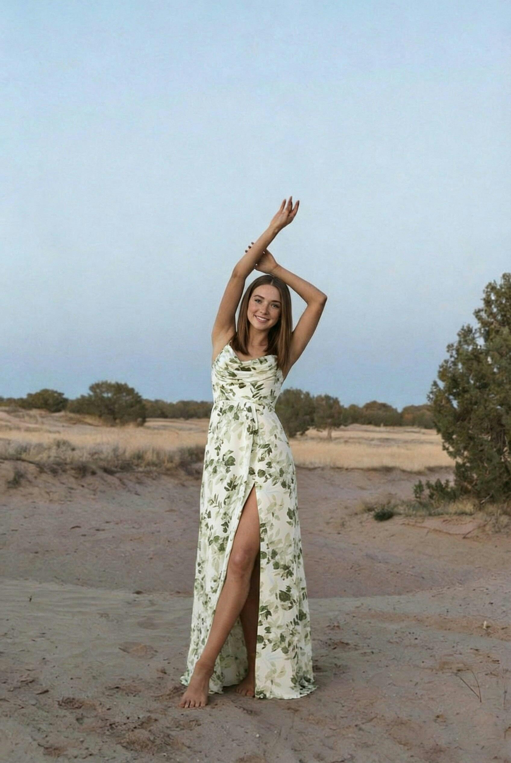 Green Floral Cowl Neck A Line Bridesmaid Dress with Slit