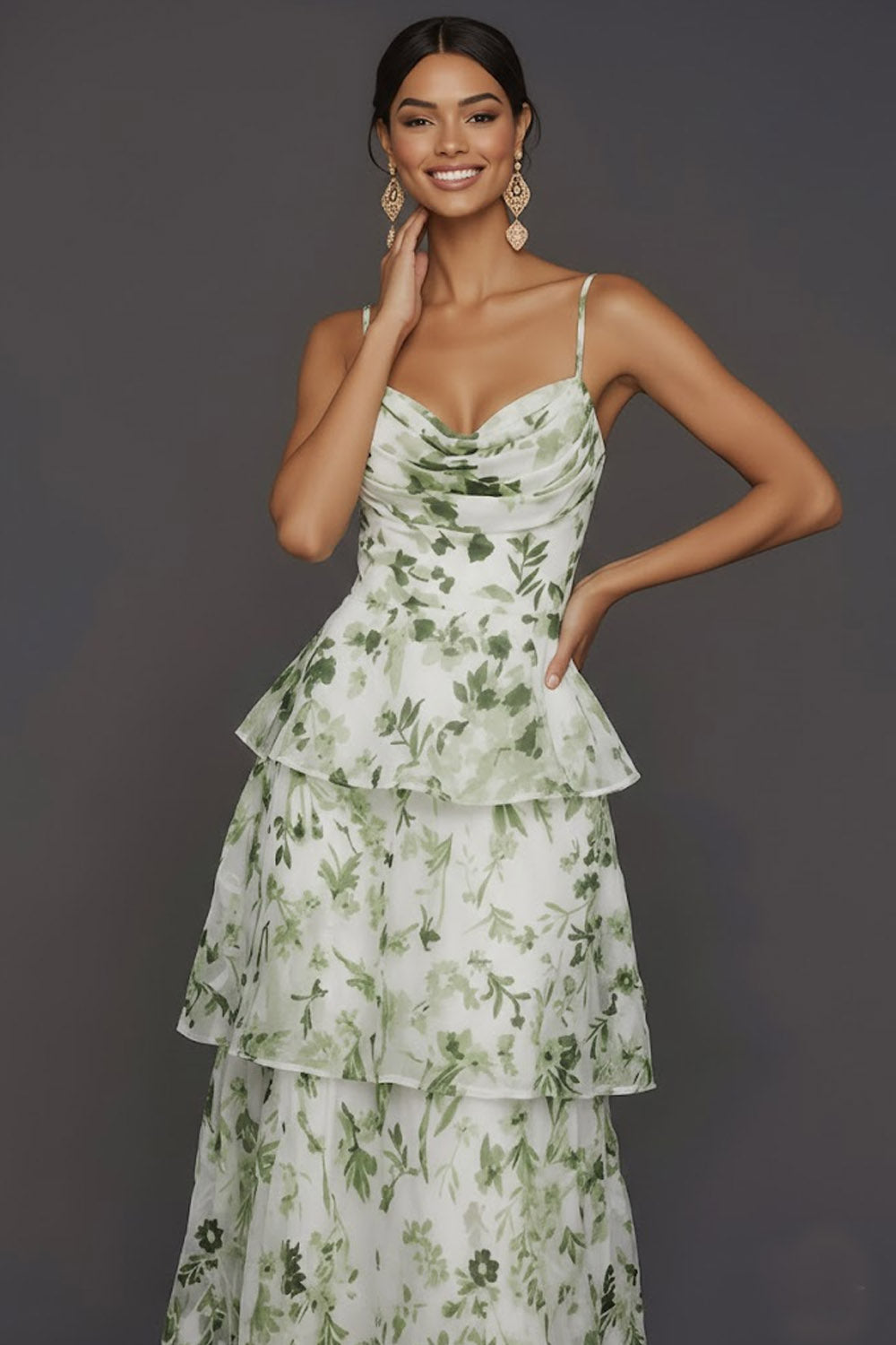 Green Floral Spaghetti Straps Ruffled Tiered Long Formal Dress