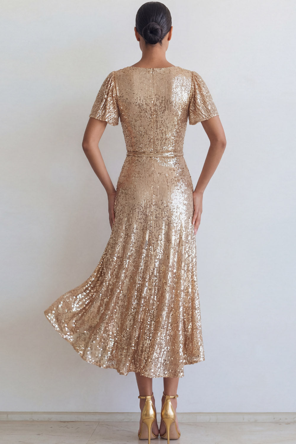 Sparkly Sequined Champagne A Line V Neck Long Formal Dress