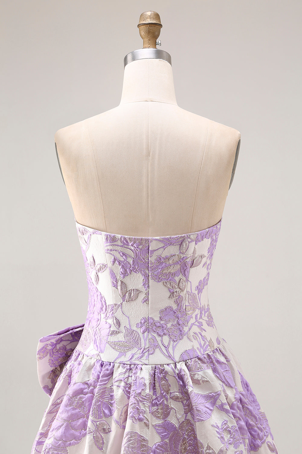 Floral Lilac Jacquard Strapless A Line Long Prom Dress with Bow