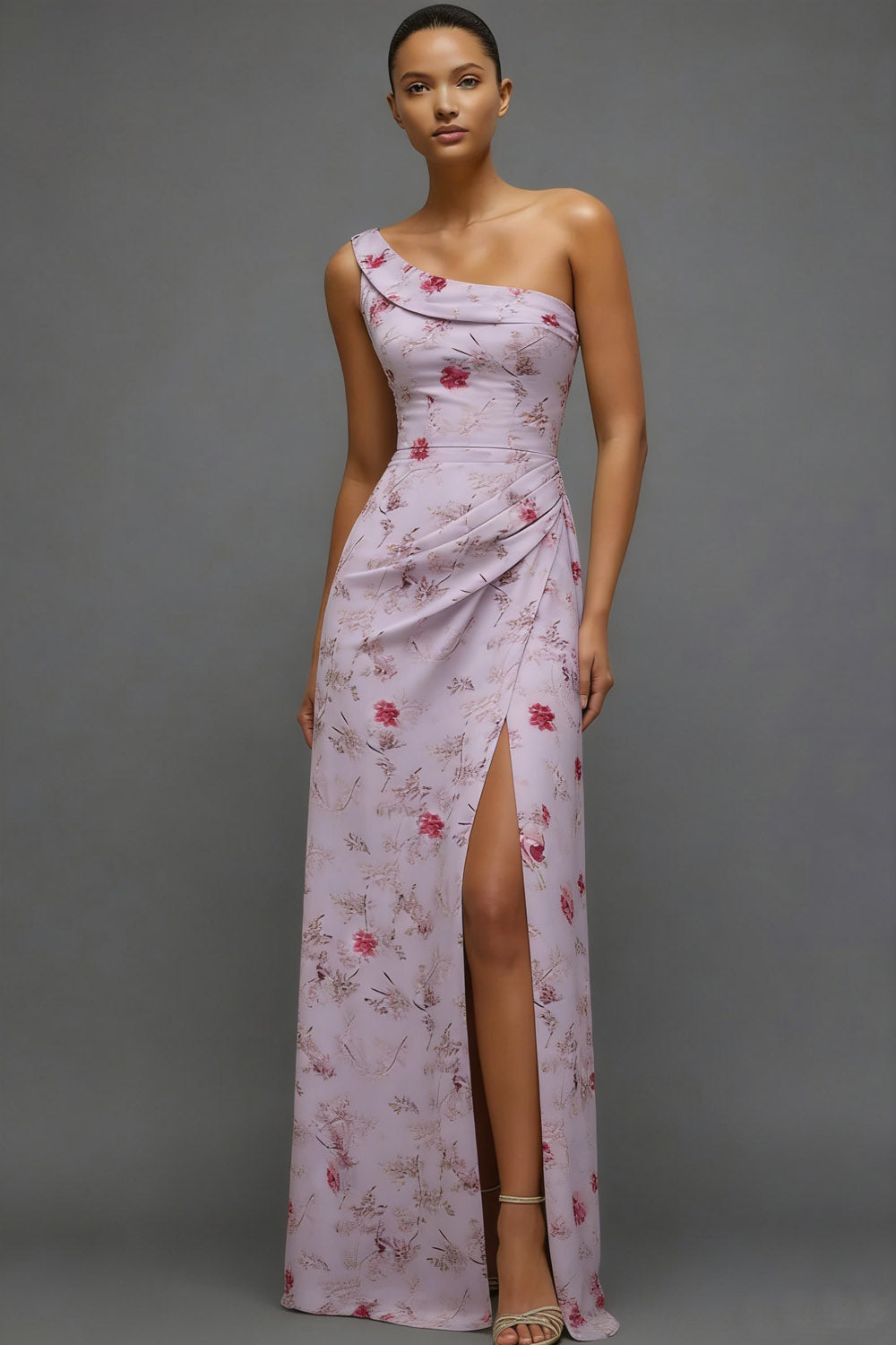 Floral Lilac One Shoulder Long Bridesmaid Dress with Slit