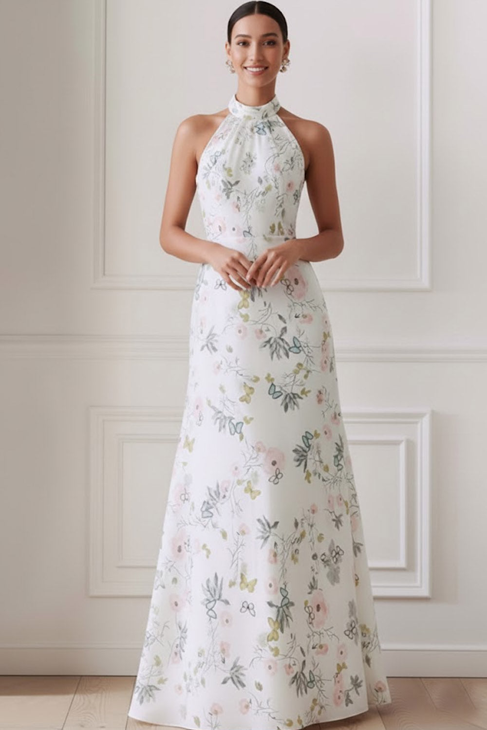 Floral White Halter Neck Backless Long Bridesmaid Dress