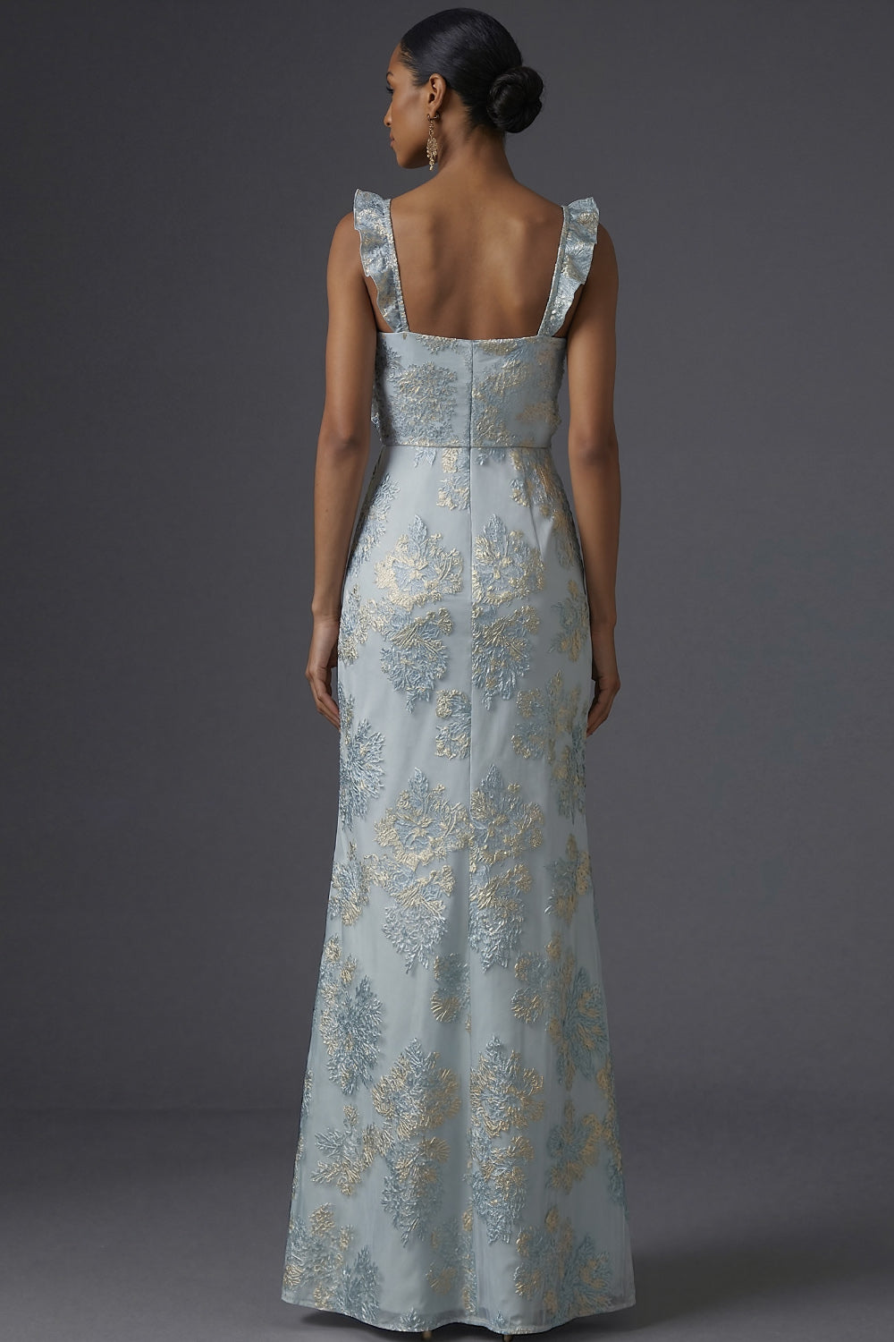 Floral Jacquard Dusty Blue Mermaid Ruffled Long Formal Dress with Slit