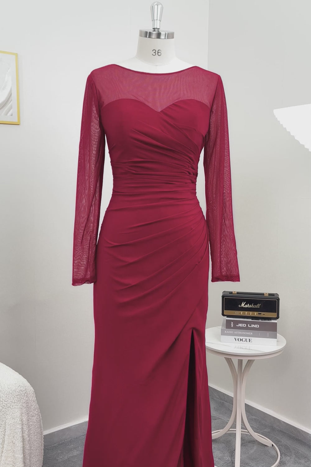 Cabernet Ruched Mermaid Illusion Neck Long Formal Dress with Silt
