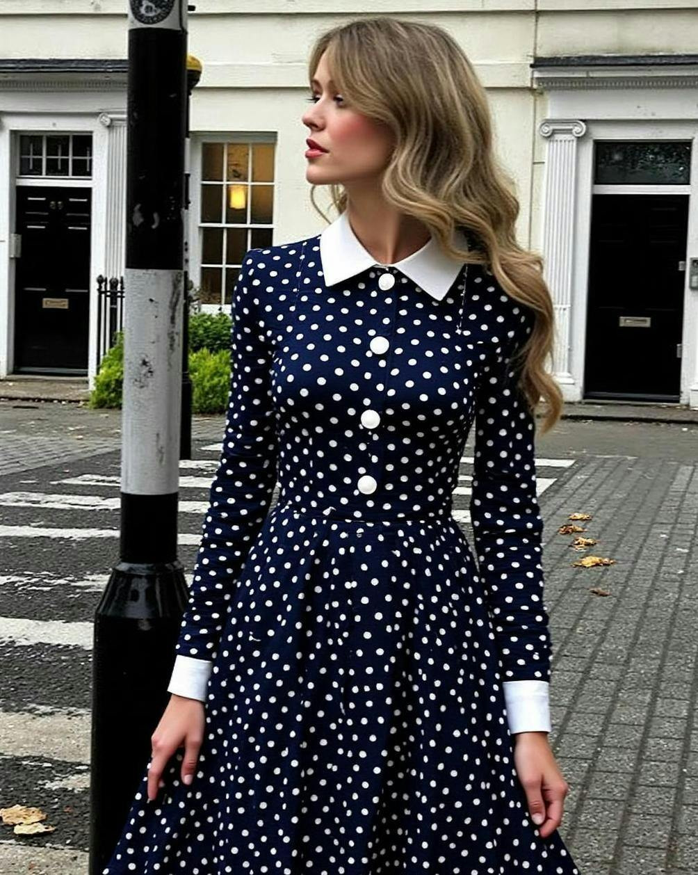 This polka dots dress is a chic and timeless piece that blends classic charm with playful elegance. The crisp collar neckline adds a touch of sophistication, giving the dress a structured yet feminine look. Featuring an A-line silhouette, it flatters the figure with a graceful flow from the waist. The tea-length hemline strikes the perfect balance between formal and casual, making it versatile for weddings, cocktail parties, or daytime celebrations. Adorned with charming polka dots, the design brings a lighthearted, retro-inspired vibe while maintaining elegance.