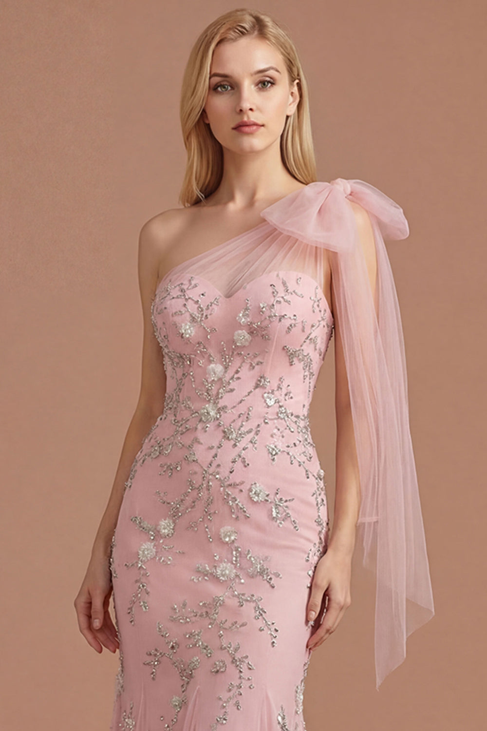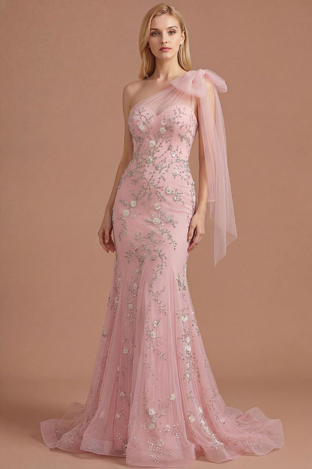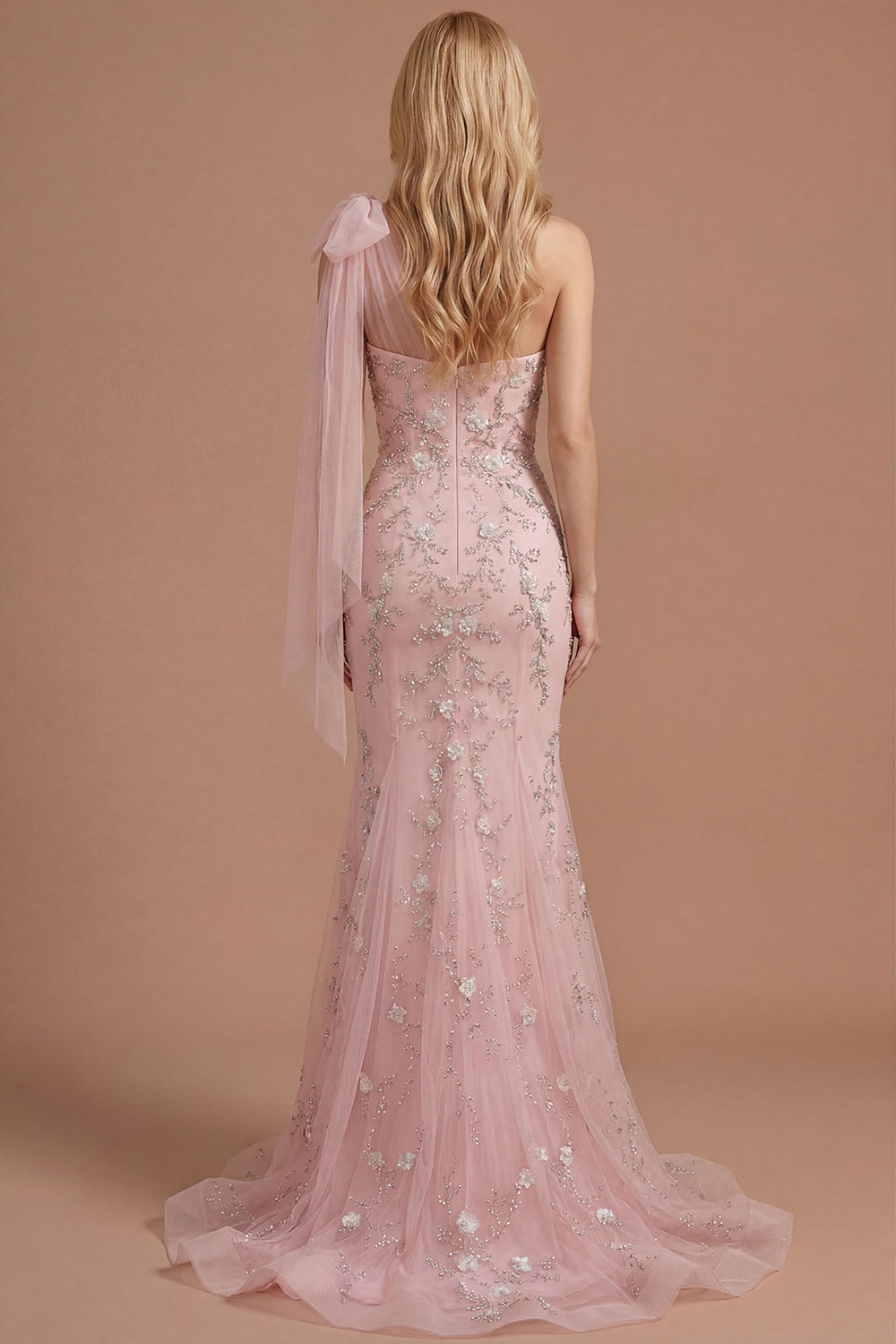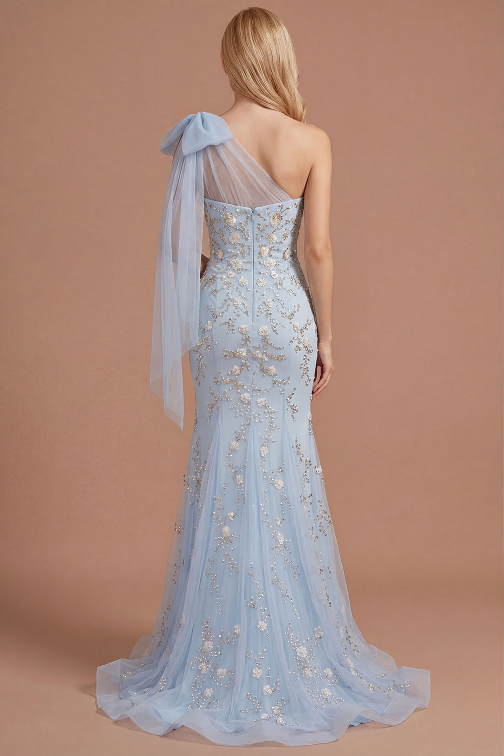 Blue Floral Mermaid One Shoulder Beaded Appliqued Long Prom Dress