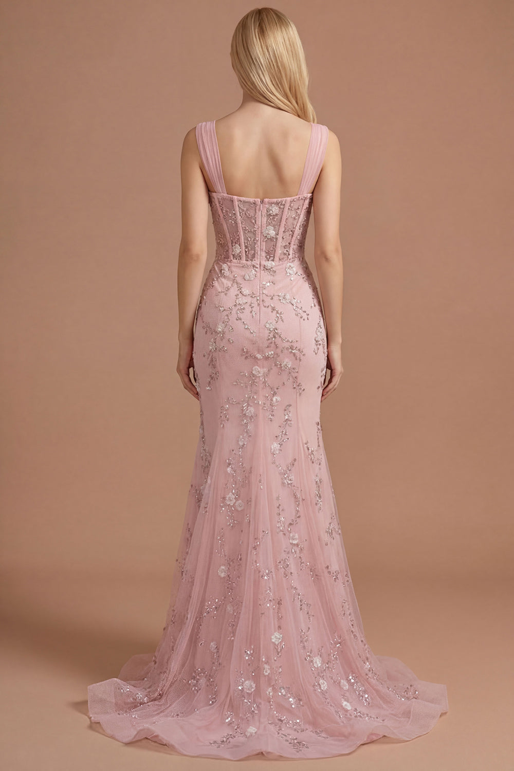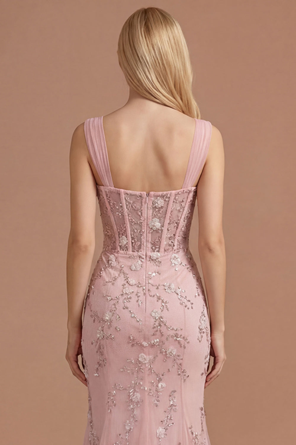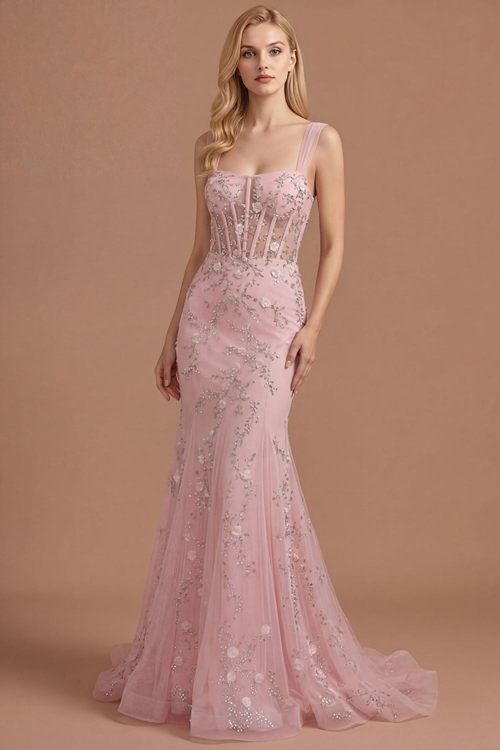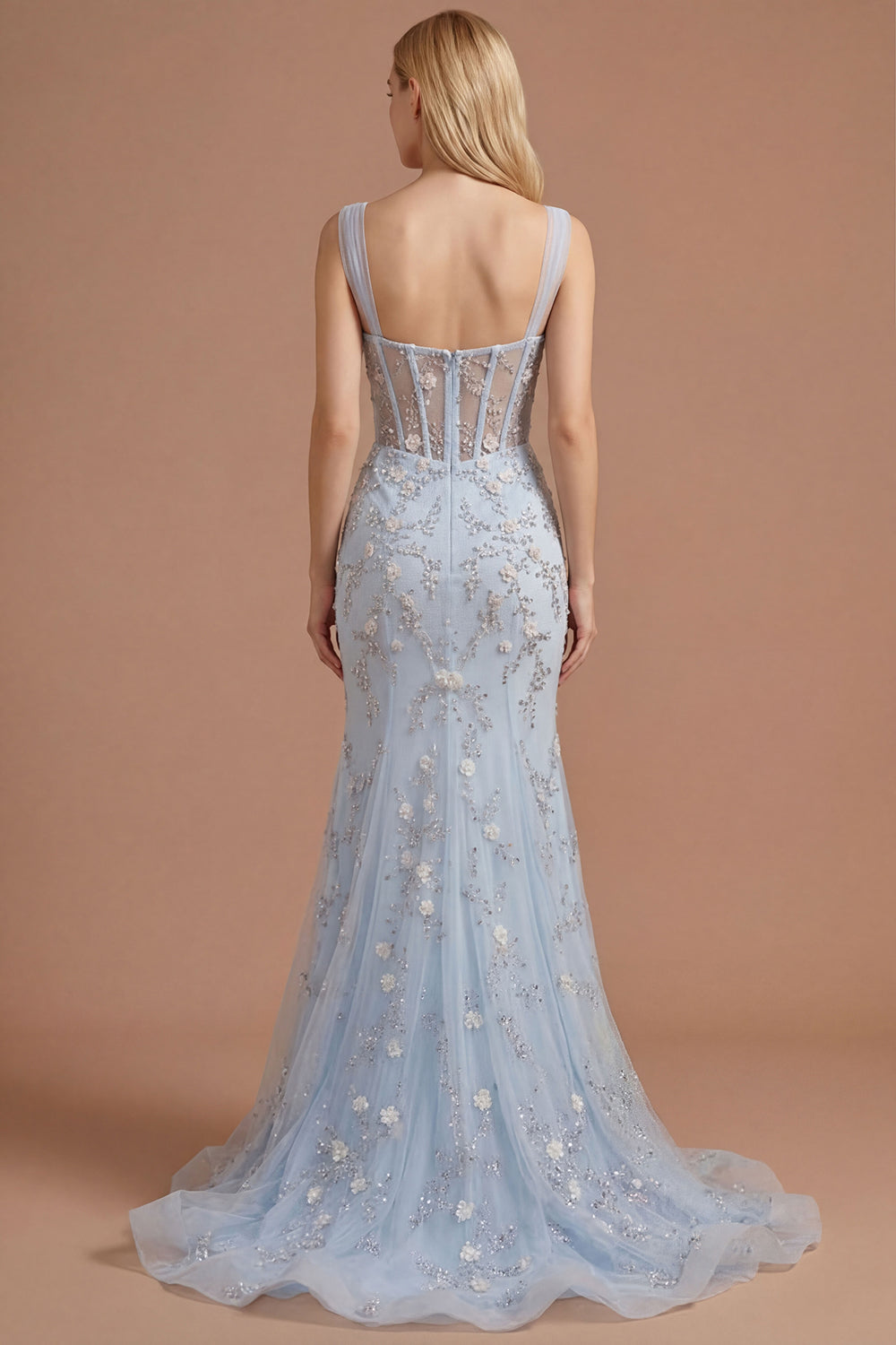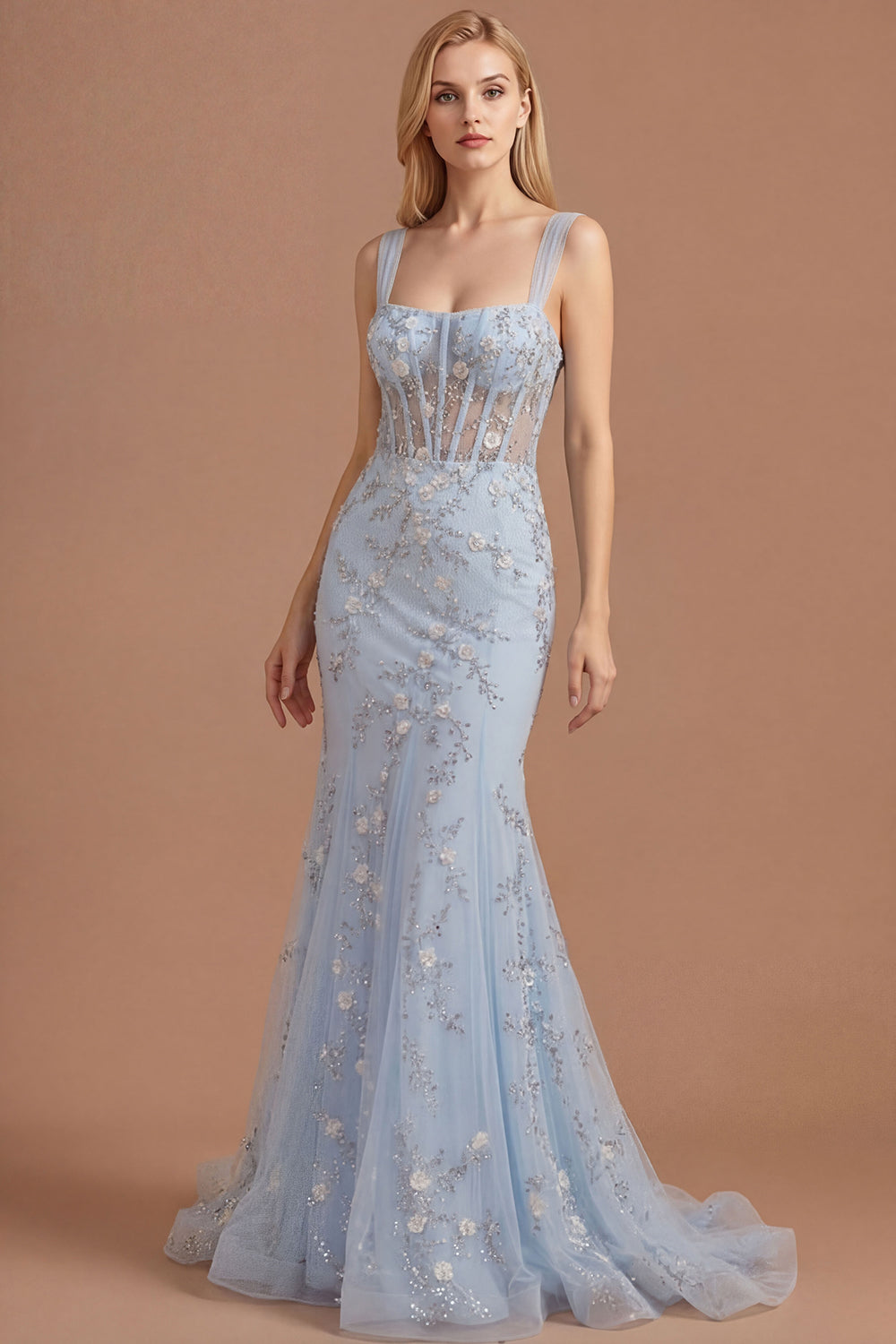 Corset Blue Floral Mermaid Thick Straps Appliqued Long Prom Dress