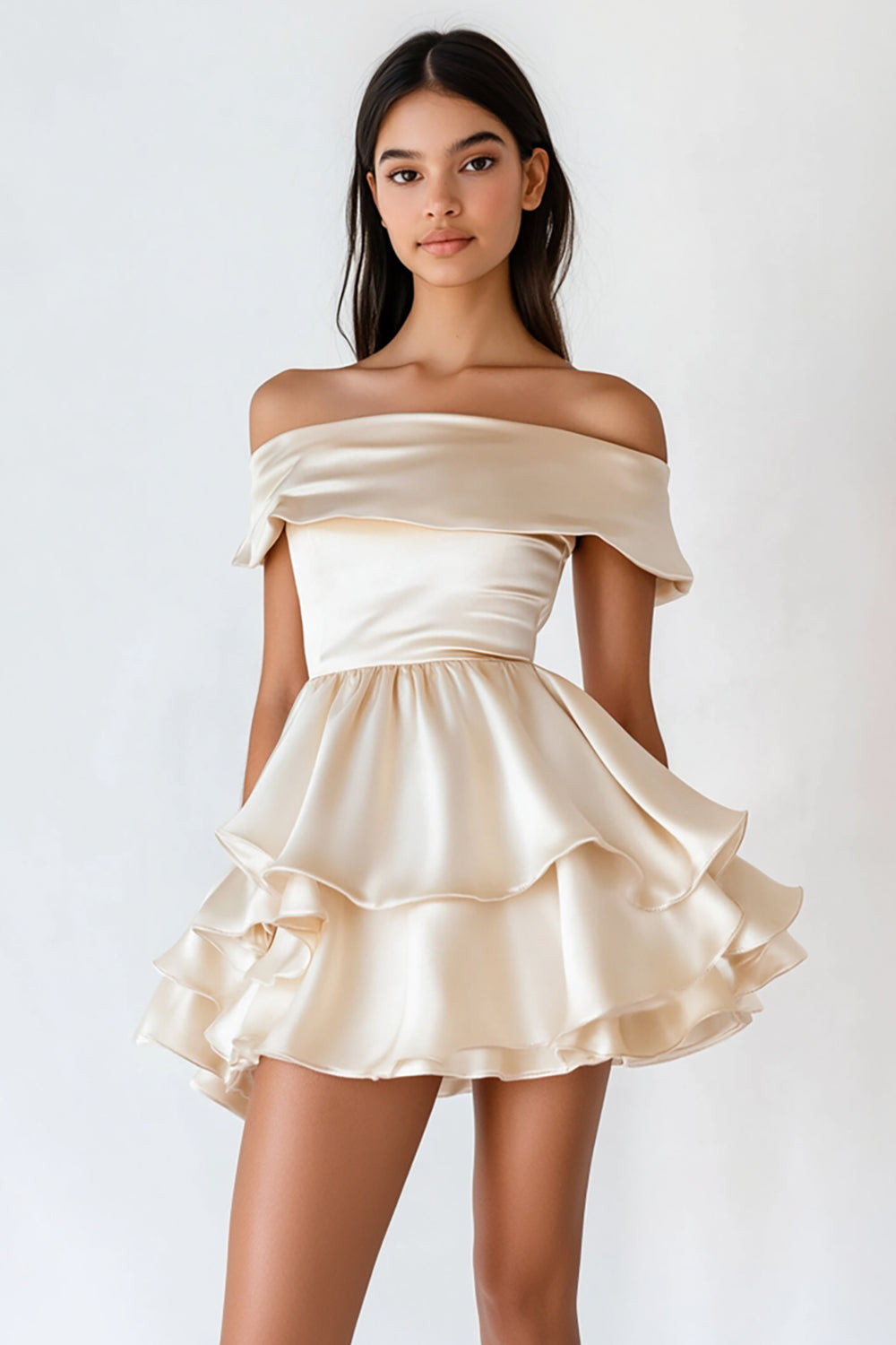 Champagne Satin Tiered Mini Graduation Dress with Ruffles