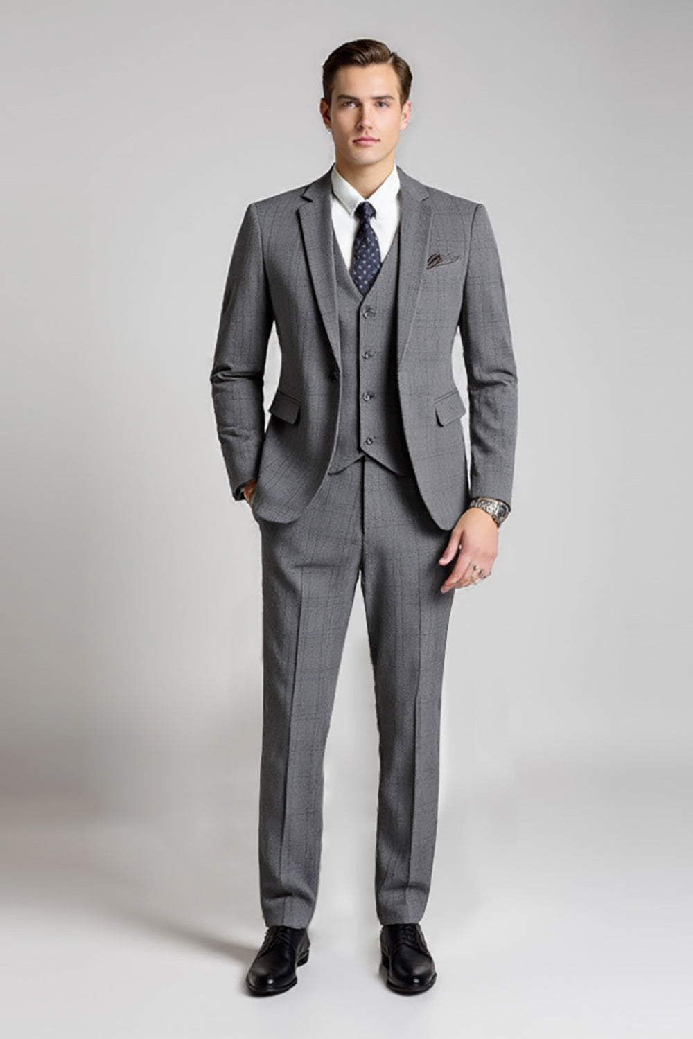 Grey Notched Lapel Plaid 3 Piece Men's Formal Suits