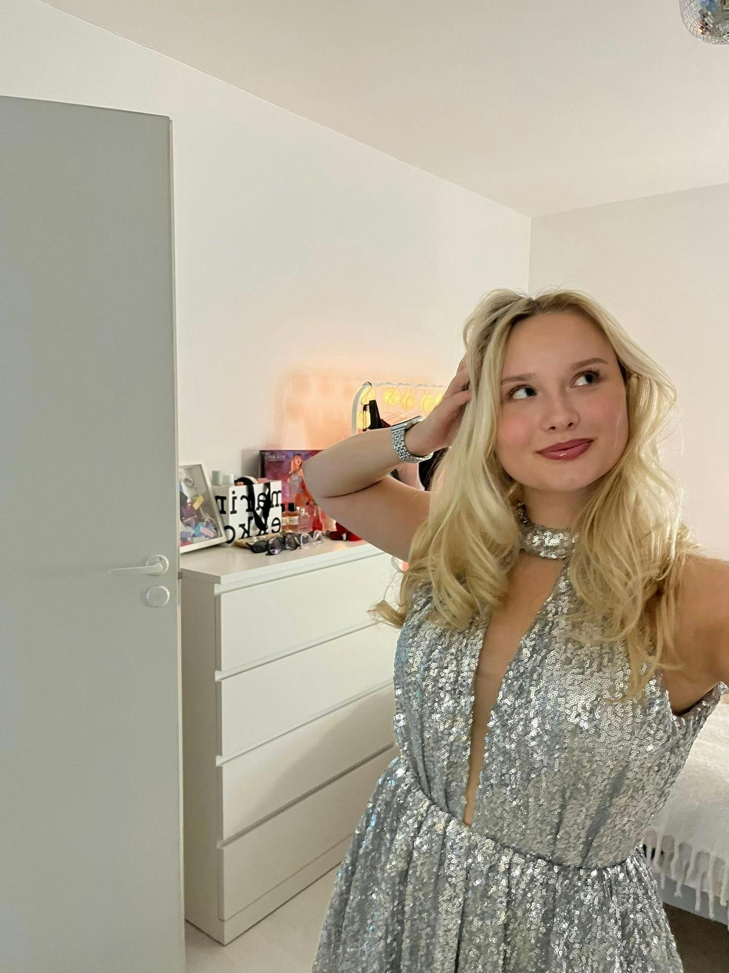 Fabric: Sequin. The fabric is comfortable for skin.