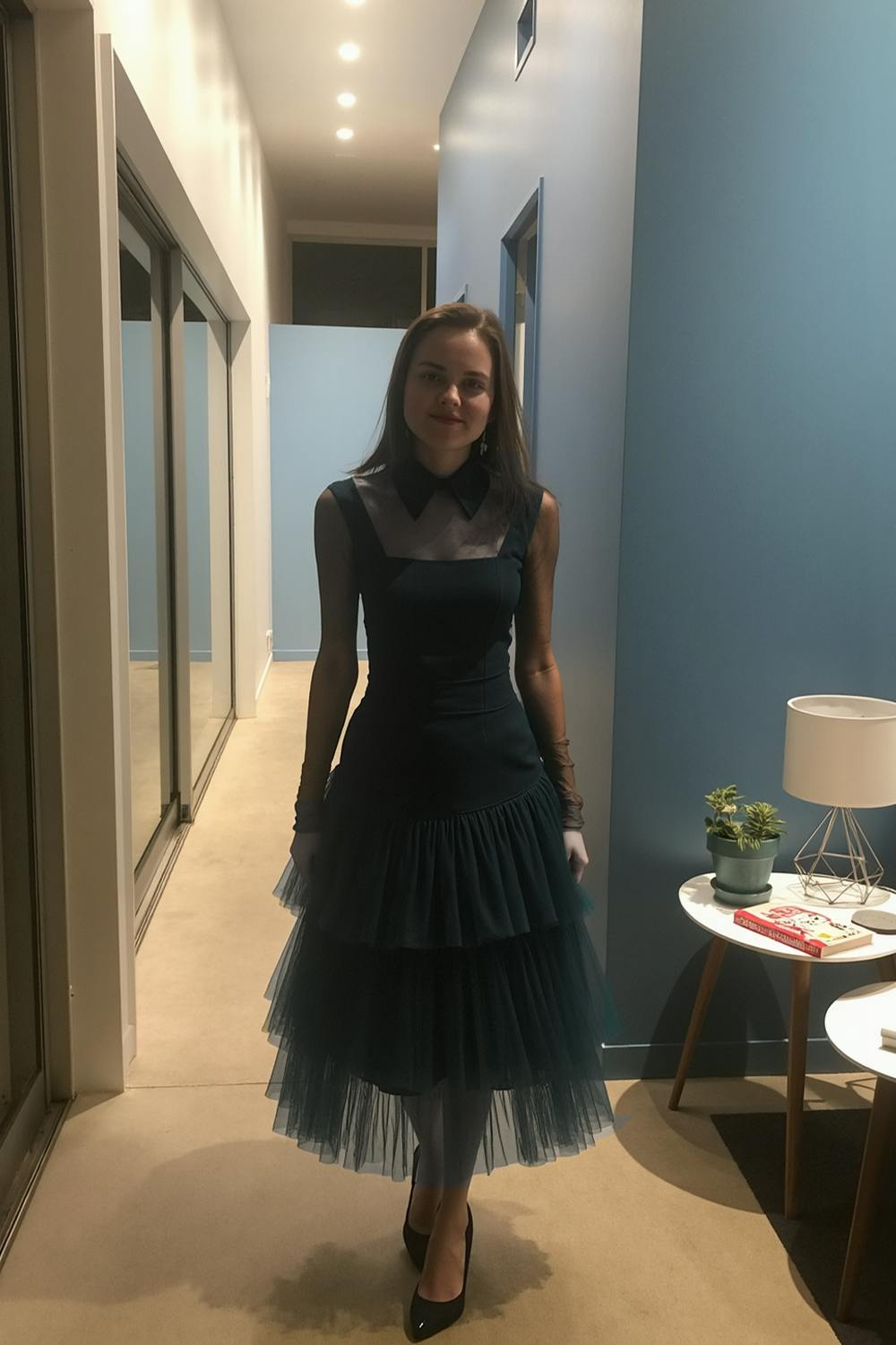 Black Collar Neck A Line Tulle Long Tiered Formal Dress with Sleeves