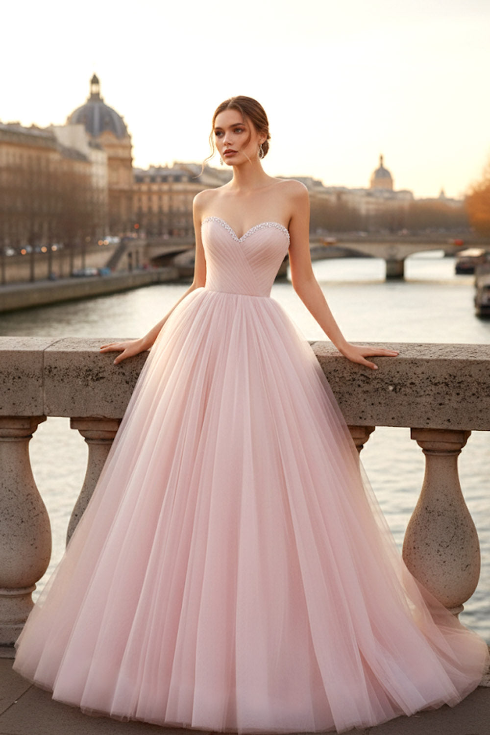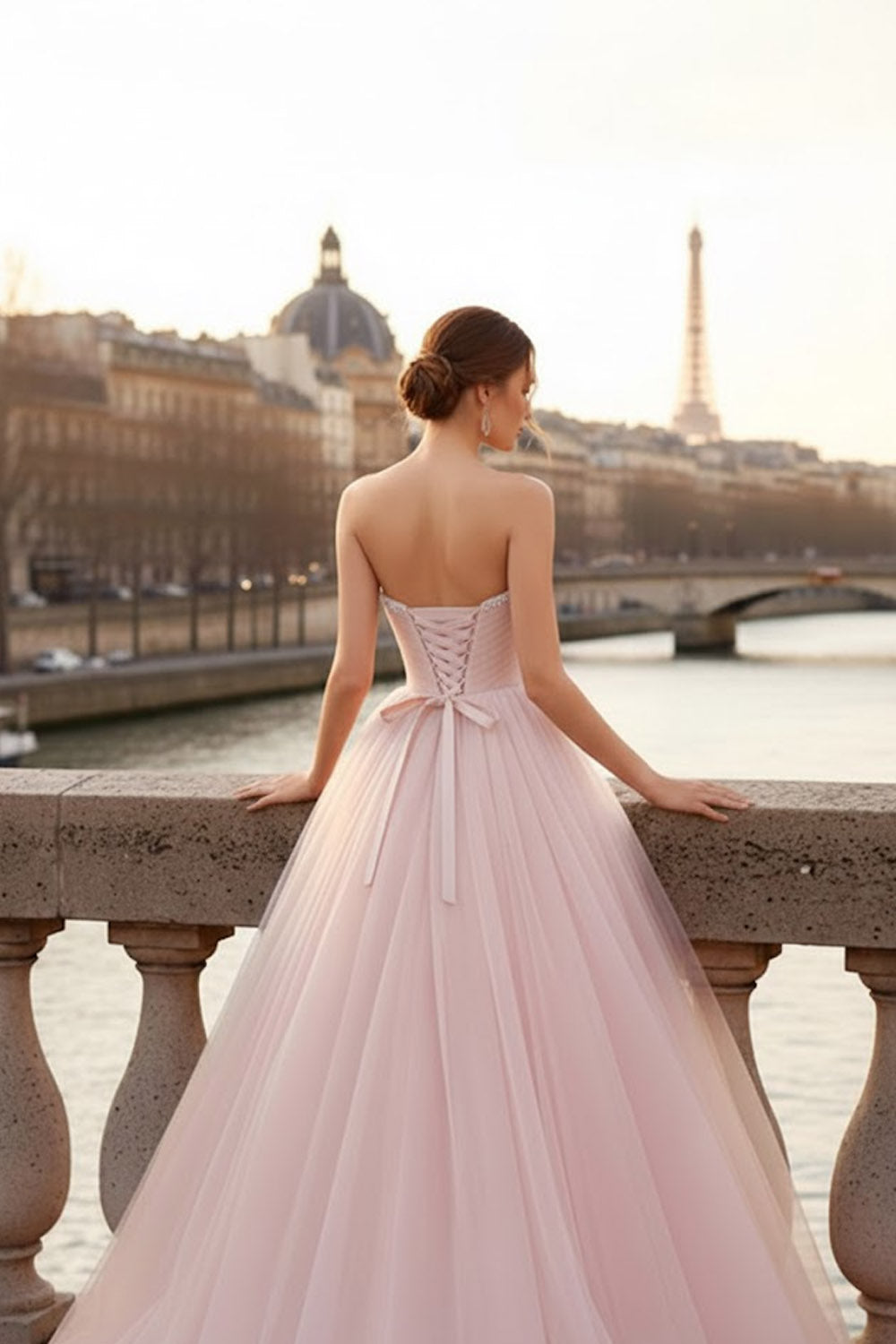 Light Pink Tulle Long Corset Prom Dress with Beading