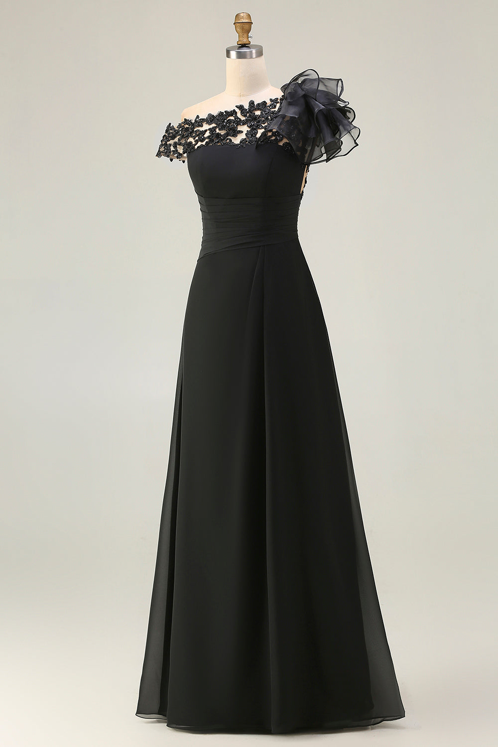Black Chiffon One Shoulder Ruffled Long Mother of the Bride Dress with Lace