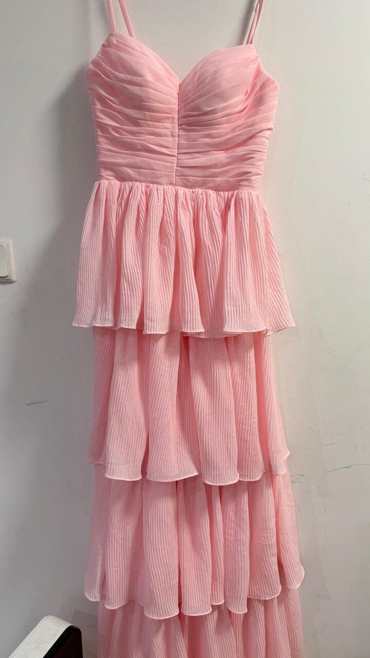 Candy Pink Chiffon Tiered Spaghetti Straps A Line Maxi Bridesmaid Dress