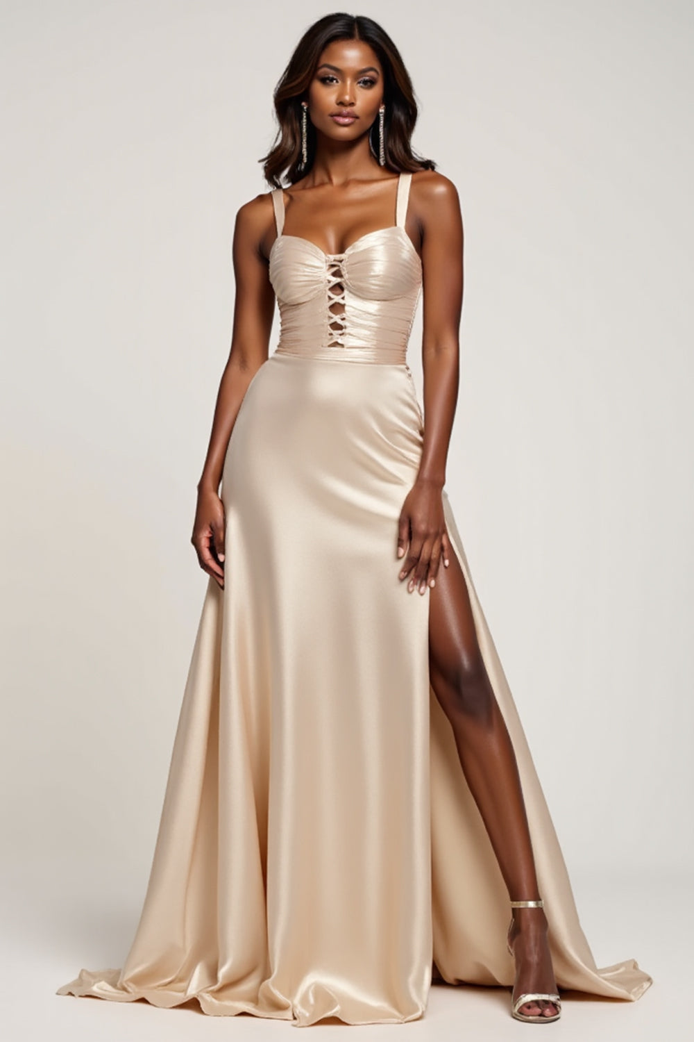 Champagne A Line Sweetheart Satin Long Prom Dress with Slit