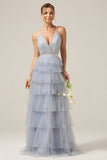 Grey Blue A Line Tiered Tulle Backless Long Prom Dress