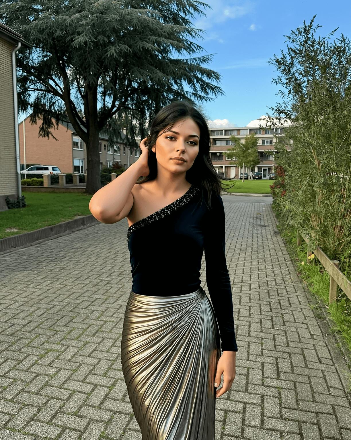 This striking party dress in shimmering black and grey metallic velvet features a sculptural one-shoulder neckline that flows into a slender floor-length silhouette. The luxurious fabric catches the light with a subtle sheen, while the elegant cut skims the figure with sophisticated precision. Perfect for holiday celebrations, this dress blends contemporary metallic tones with timeless velvet texture for a truly memorable entrance.