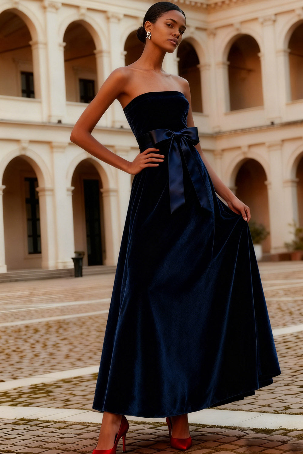 Navy A-Line Strapless Velvet Long Formal Dress with Bow