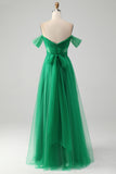 Off the Shoulder Dark Green Pleated A Line Tulle Bridesmaid Dress