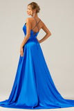 Royal Blue A Line Spaghetti Straps Satin Prom Dress with Slit
