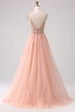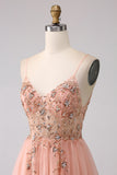 Spaghetti Straps Corset Beading A-Line Tulle Long Prom Dress with Slit