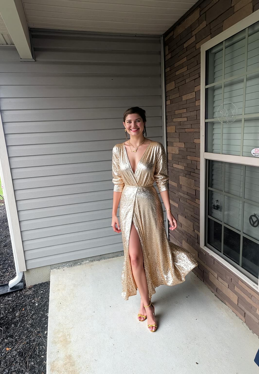 Sparkly Champagne Sequins V-Neck Long Evening Dress with Slit