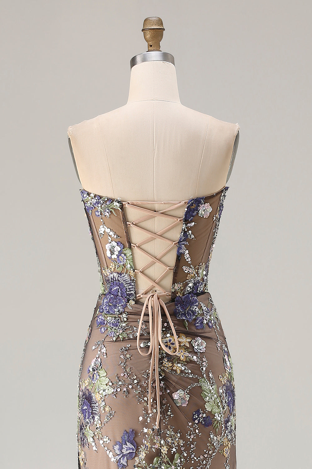 Sparkly Floral Black Mermaid Beaded Long Corset Prom Dress with Slit
