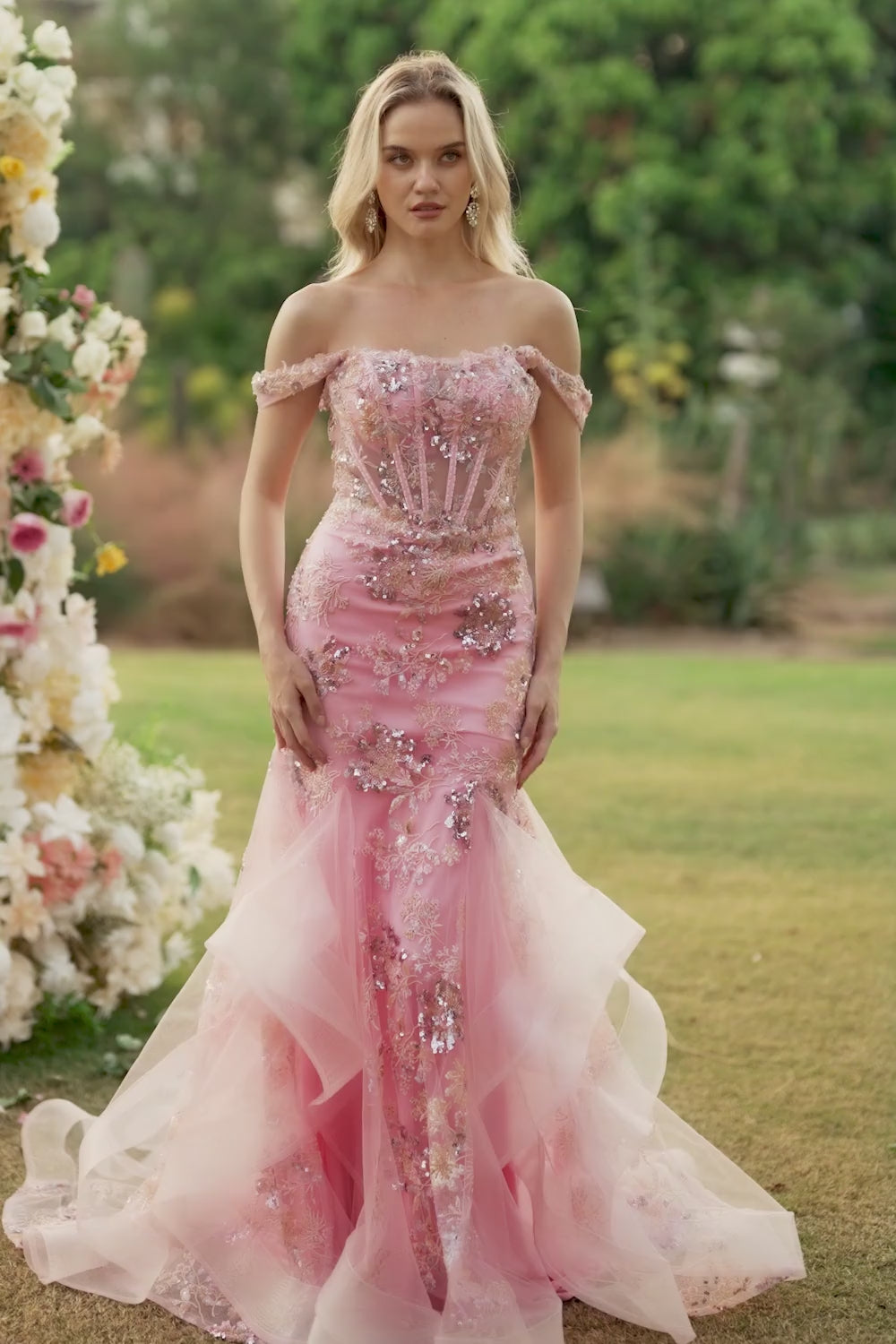Sparkly Floral Green Mermaid Long Corset Prom Dress with Ruffles